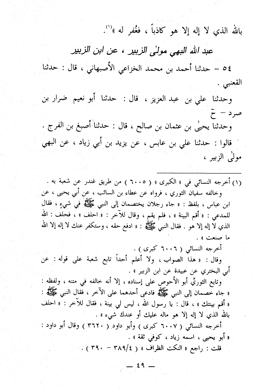 54 - حَدَّثَنَا أَحْمَدُ بن مُحَمَّدٍ الْخُزَاعِي الأَصْبَهَانِيُّ، قَالَ: حَدَّثَنَا الْقَعْنَبِيُّ، وَحَدَّثَنَا عَلِيُّ بن عَبْدِ الْعَزِيزِ، قَالَ: حَدَّثَنَا أَبُو نُعَيْمٍ ضِرَارُ بن صُرَدٍ. ح وَحَدَّثَنَا يَحْيَى بن عُثْمَانَ بن صَالِحٍ، قَالَ: حَدَّثَنَا أَصْبَغُ بن الْفَرَجِ، قَالُوا: حَدَّثَنَا عَلِيُّ بن عَابِسٍ، عَنْ يَزِيدَ بن أَبِي زِيَادٍ، عَنِ الْبَهِيِّ مَوْلَى الزُّبَيْرِ،@