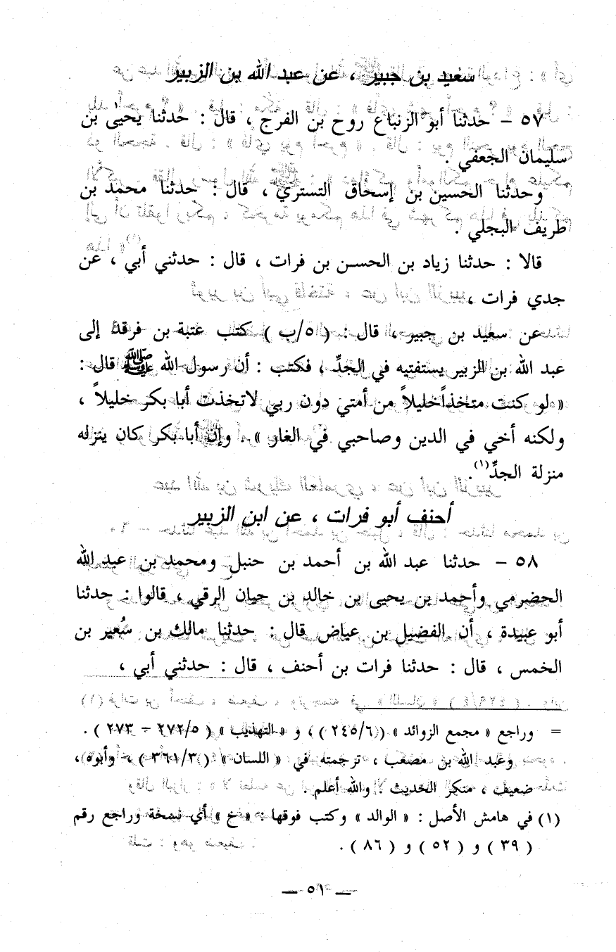 58 - حَدَّثَنَا عَبْدُ اللَّهِ بن أَحْمَدَ بن حَنْبَلٍ، وَمُحَمَّدُ بن عَبْدِ اللَّهِ الْحَضْرَمِيُّ، وأحمد بن يحيى بن خالد بن حيان الرقي، قَالُوا: حَدَّثَنَا أَبُو عُبَيْدَةَ، أَنَّ الْفُضَيْلَ بن عِيَاضٍ، قَالَ: حَدَّثَنَا مَالِكُ بن سُعَيْرِ بن الْخِمْسِ، قَالَ: حَدَّثَنَا فُرَاتُ بن أَحْنَفَ، قَالَ: حَدَّثَنِي أَبِي،@