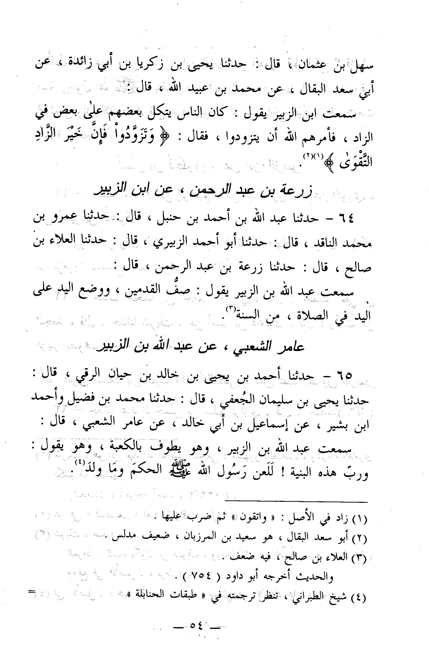 64 - حَدَّثَنَا عَبْدُ اللَّهِ بن أَحْمَدَ بن حَنْبَلٍ، قَالَ: حَدَّثَنَا عَمْرُو بن مُحَمَّدٍ النَّاقِدُ، قَالَ: حَدَّثَنَا أَبُو أَحْمَدَ الزُّبَيْرِيُّ، قَالَ: حَدَّثَنَا الْعَلاءُ بن صَالِحٍ، قَالَ: حَدَّثَنَا زُرْعَةُ بن عَبْدِ الرَّحْمَنِ، قَالَ: سَمِعْتُ عَبْدَ اللَّهِ بن الزُّبَيْرِ، يَقُولُ:"صَفُّ الْقَدَمَيْنِ، وَوَضْعُ الْيَدِ عَلَى الْيَدِ فِي الصَّلاةِ، مِنَ السُّنَّةِ".