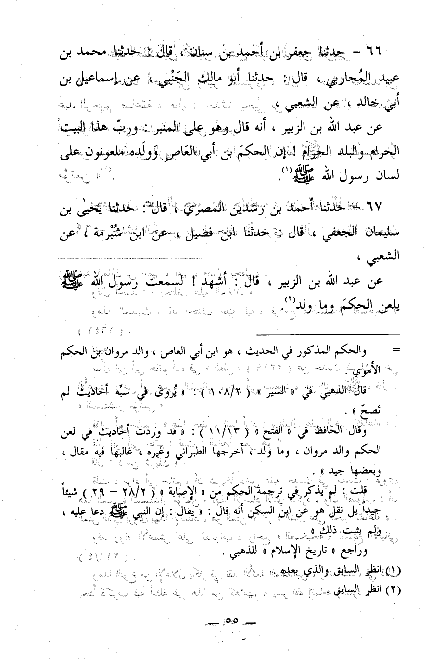 66 - حَدَّثَنَا جَعْفَرُ بن أَحْمَدَ بن سَنَّانٍ، قَالَ: حَدَّثَنَا مُحَمَّدُ بن عُبَيْدٍ الْمُحَارِبِيُّ، قَالَ: حَدَّثَنَا أَبُو مَالِكٍ الْجَنْبِيُّ، عَنْ إِسْمَاعِيلَ بن أَبِي خَالِدٍ، عَنِ الشَّعْبِيِّ، عَنْ عَبْدِ اللَّهِ بن الزُّبَيْرِ، أَنَّهُ قَالَ وَهُوَ عَلَى الْمِنْبَرِ:"وَرَبِّ هَذَا الْبَيْتِ الْحَرَامِ، وَالْبَلَدِ الْحَرَامِ، إِنَّ الْحَكَمَ بن أَبِي الْعَاصِ وَوَلَدِهِ مَلْعُونُونَ عَلَى لِسَانِ رَسُولِ اللَّهِ صَلَّى اللَّهُ عَلَيْهِ وَسَلَّمَ".