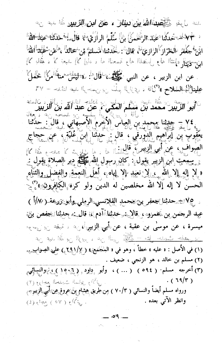 74 - حَدَّثَنَا مُحَمَّدُ بن الْعَبَّاسِ الأَخْرَمُ الأَصْبَهَانِيُّ، قَالَ: حَدَّثَنَا يَعْقُوبُ بن إِبْرَاهِيمَ الدَّوْرَقِيُّ، قَالَ: حَدَّثَنَا ابْنُ عُلَيَّةَ، عَنْ حَجَّاجٍ الصَّوَّافِ، عَنْ أَبِي الزُّبَيْرِ، قَالَ: سَمِعْتُ ابْنَ الزُّبَيْرِ، يَقُولُ:"كَانَ رَسُولُ اللَّهِ صَلَّى اللَّهُ عَلَيْهِ وَسَلَّمَ دُبُرَ الصَّلاةِ، يَقُولُ:"لا إِلَهَ إِلا اللَّهُ، لا نَعْبَدُ إِلا إِيَّاهُ، أَهْلُ النِّعْمَةِ، وَالْفَضْلِ، وَالثَّنَاءِ الْحَسِنِ، لا إِلَهَ إِلا اللَّهُ، مُخْلِصِينَ لَهُ الدِّينَ، وَلَوْ كَرِهَ الْكَافِرُونَ".