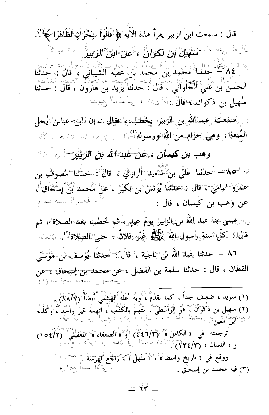 85 - حَدَّثَنَا عَلِيُّ بن سَعِيدٍ الرَّازِيُّ، قَالَ: حَدَّثَنَا مُصَرِّفُ بن عُمَرَو الْيَامِيُّ، قَالَ: حَدَّثَنَا يُونُسُ بن بُكَيْرٍ، عَنْ مُحَمَّدِ بن إِسْحَاقَ، عَنْ وَهْبِ بن كَيْسَانَ، قَالَ: صَلَّى بنا عَبْدُ اللَّهِ بن الزُّبَيْرِ يَوْمَ عِيدٍ، ثُمَّ خَطَبَ بَعْدَ الصَّلاةِ، ثُمَّ قَالَ:"كُلَّ سُنَّةِ رَسُولِ اللَّهِ صَلَّى اللَّهُ عَلَيْهِ وَسَلَّمَ غَيَّرَ فُلانٌ، حَتَّى الصَّلاةَ".