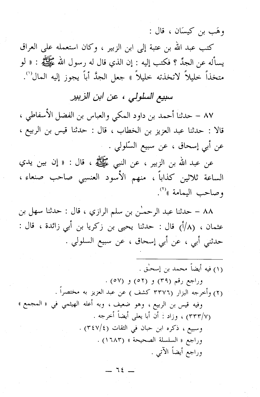 87 - حَدَّثَنَا أَحْمَدُ بن دَاوُدَ الْمَكِّيُّ، وَالْعَبَّاسُ بن الْفَضْلِ الأَسْفَاطِيُّ، قَالا: حَدَّثَنَا عَبْدُ الْعَزِيزِ بن الْخَطَّابِ، قَالَ: حَدَّثَنَا قَيْسُ بن الرَّبِيعِ، عَنْ أَبِي إِسْحَاقَ، عَنْ سُبَيْعٍ السَّلُولِيُّ، عَنْ عَبْدِ اللَّهِ بن الزُّبَيْرِ، عَنِ النَّبِيِّ صَلَّى اللَّهُ عَلَيْهِ وَسَلَّمَ، قَالَ:"إِنَّ بَيْنَ يَدَيِ السَّاعَةِ ثَلاثِينَ كَذَّابًا، مِنْهُمُ الأَسْوَدُ الْعَنْسِيُّ صَاحِبُ صَنْعَاءَ، وَصَاحِبُ الْيَمَامَةِ". حَدَّثَنَا عَبْدُ الرَّحْمَنِ بن سَلْمٍ الرَّازِيُّ، قَالَ: حَدَّثَنَا سَهْلُ بن عُثْمَانَ، قَالَ: حَدَّثَنَا يَحْيَى بن زَكَرِيَّا بن أَبِي زَائِدَةَ، قَالَ: حَدَّثَنِي أَبِي، عَنْ أَبِي إِسْحَاقَ، عَنْ سُبَيْعٍ السَّلُولِيِّ،@