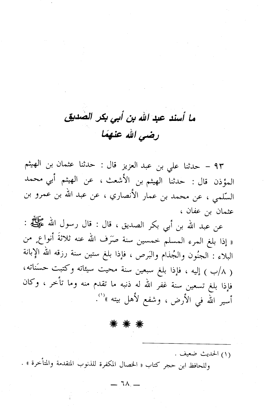 93 - حَدَّثَنَا عَلِيُّ بن عَبْدِ الْعَزِيزِ، قَالَ: حَدَّثَنَا عُثْمَانُ بن الْهَيْثَمِ الْمُؤَذِّنُ، قَالَ: حَدَّثَنَا ابْنُ الأَشْعَثِ، عَنِ الْهَيْثَمِ أَبِي مُحَمَّدٍ السُّلَمِيِّ، عَنْ مُحَمَّدِ بن عَمَّارٍ الأَنْصَارِيِّ، عَنْ عَبْدِ اللَّهِ بن عَمْرِو بن عُثْمَانَ بن عَفَّانَ، عَنْ عَبْدِ اللَّهِ بن أَبِي بَكْرٍ الصِّدِّيقِ، قَالَ: قَالَ رَسُولُ اللَّهِ صَلَّى اللَّهُ عَلَيْهِ وَسَلَّمَ:"إِذَا بَلَغَ الْمَرْءُ الْمُسْلِمُ خَمْسِينَ سَنَةً، صَرَفَ اللَّهُ عَنْهُ ثَلاثَةَ أَنْوَاعٍ مِنَ الْبَلاءِ: الْجُنُونَ، وَالْجُذَامَ، وَالْبَرَصَ، فَإِذَا بَلَغَ سِتِّينَ سَنَةً رَزَقَهُ اللَّهُ الإِنَابَةَ إِلَيْهِ، فَإِذَا بَلَغَ سَبْعِينَ سَنَةً مُحِيَتْ سَيِّئَاتُهُ، وَكُتِبَتْ حَسَنَاتُهُ، فَإِذَا بَلَغَ تِسْعِينَ سَنَةً غَفَرَ اللَّهُ لَهُ ذَنْبَهُ مَا تَقَدَّمَ مِنْهُ وَمَا تَأَخَّرَ، وَكَانَ أَسِيرَ اللَّهِ فِي الأَرْضِ، وَشَفَعَ لأَهْلِ بَيْتِهِ".@