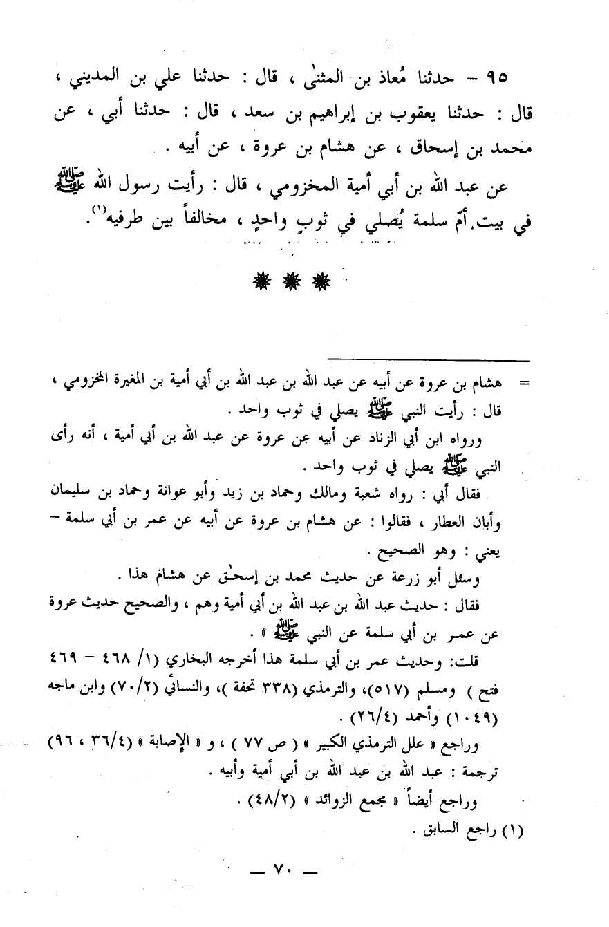 95 - حَدَّثَنَا مُعَاذُ بن الْمُثَنَّى، قَالَ: حَدَّثَنَا عَلِيُّ بن الْمَدِينِيِّ، قَالَ: حَدَّثَنَا يَعْقُوبُ بن إِبْرَاهِيمَ بن سَعْدٍ، قَالَ: حَدَّثَنَا أَبِي، عَنْ مُحَمَّدِ بن إِسْحَاقَ، عَنْ هِشَامِ بن عُرْوَةَ، عَنْ أَبِيهِ، عَنْ عَبْدِ اللَّهِ بن أَبِي أُمَيَّةَ الْمَخْزُومِيِّ، قَالَ:"رَأَيْتُ رَسُولَ اللَّهِ صَلَّى اللَّهُ عَلَيْهِ وَسَلَّمَ فِي بَيْتِ أُمِّ سَلَمَةَ، يُصَلِّي فِي ثَوْبٍ وَاحِدٍ، مُخَالِفًا بَيْنَ طَرَفَيْهِ".@
