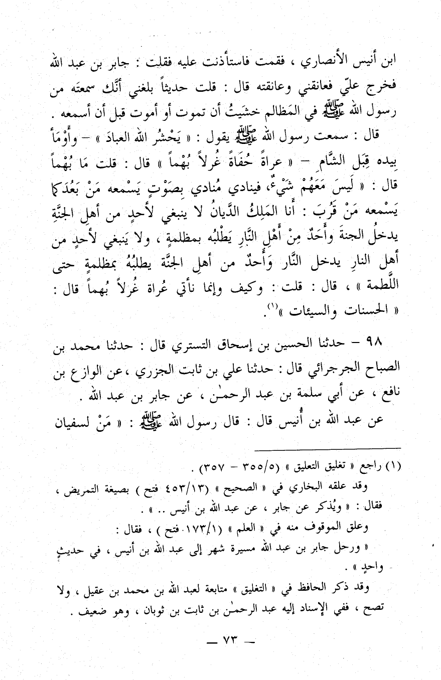 بن أُنَيْسٍ الأَنْصَارِيَ، فَقُمْتُ، فَاسْتَأْذَنْتُ عَلَيْهِ، فَقُلْتُ: جَابِرُ بن عَبْدِ اللَّهِ، فَخَرَجَ عَلَيَّ، فَعَانَقَنِي وَعَانَقْتُهُ، قَالَ: قُلْتَ: حَدِيثًا بَلَغَنِي أَنَّكَ سَمِعْتَهُ مِنْ رَسُولِ اللَّهِ صَلَّى اللَّهُ عَلَيْهِ وَسَلَّمَ فِي الْمَظَالِمِ، خَشِيتُ أَنْ تَمُوتَ، أَوْ أَمُوتَ قَبْلَ أَنْ أَسْمَعَهُ. قَالَ: سَمِعْتُ رَسُولَ اللَّهِ صَلَّى اللَّهُ عَلَيْهِ وَسَلَّمَ، يَقُولُ:"يَحْشُرُ اللَّهُ الْعِبَادَ"، وَأَوْمَأَ بِيَدِهِ قِبَلَ الشَّامِ،"عُرَاةً حُفَاةً غُرْلا بُهْمًا". قَالَ: قُلْتُ: مَا بُهْمًا؟ قَالَ:"لَيْسَ مَعَهُمْ شَيْءٌ، فَيُنَادِي مُنَادِي بِصَوْتٍ يَسْمَعُهُ مَنْ بَعُدَ كَمَا يَسْمَعُهُ مَنْ قَرُبَ: أَنَا الْمَلِكُ الدَّيَانُ، لا يَنْبَغِي لأَحَدٍ مِنْ أَهْلِ الْجَنَّةِ يَدْخُلُ الْجَنَّةَ، وَأَحَدٌ مِنْ أَهْلِ النَّارِ يَطْلُبُهُ بِمَظْلَمَةٍ حَتَّى اللَّطْمَةٍ"، قَالَ: قُلْتُ: وَكَيْفَ، وَإِنَّمَا نَأْتِي عُرَاةً غُرْلا بُهْمًا؟ قَالَ:"الْحَسَنَاتُ وَالسَّيِّئَاتُ"