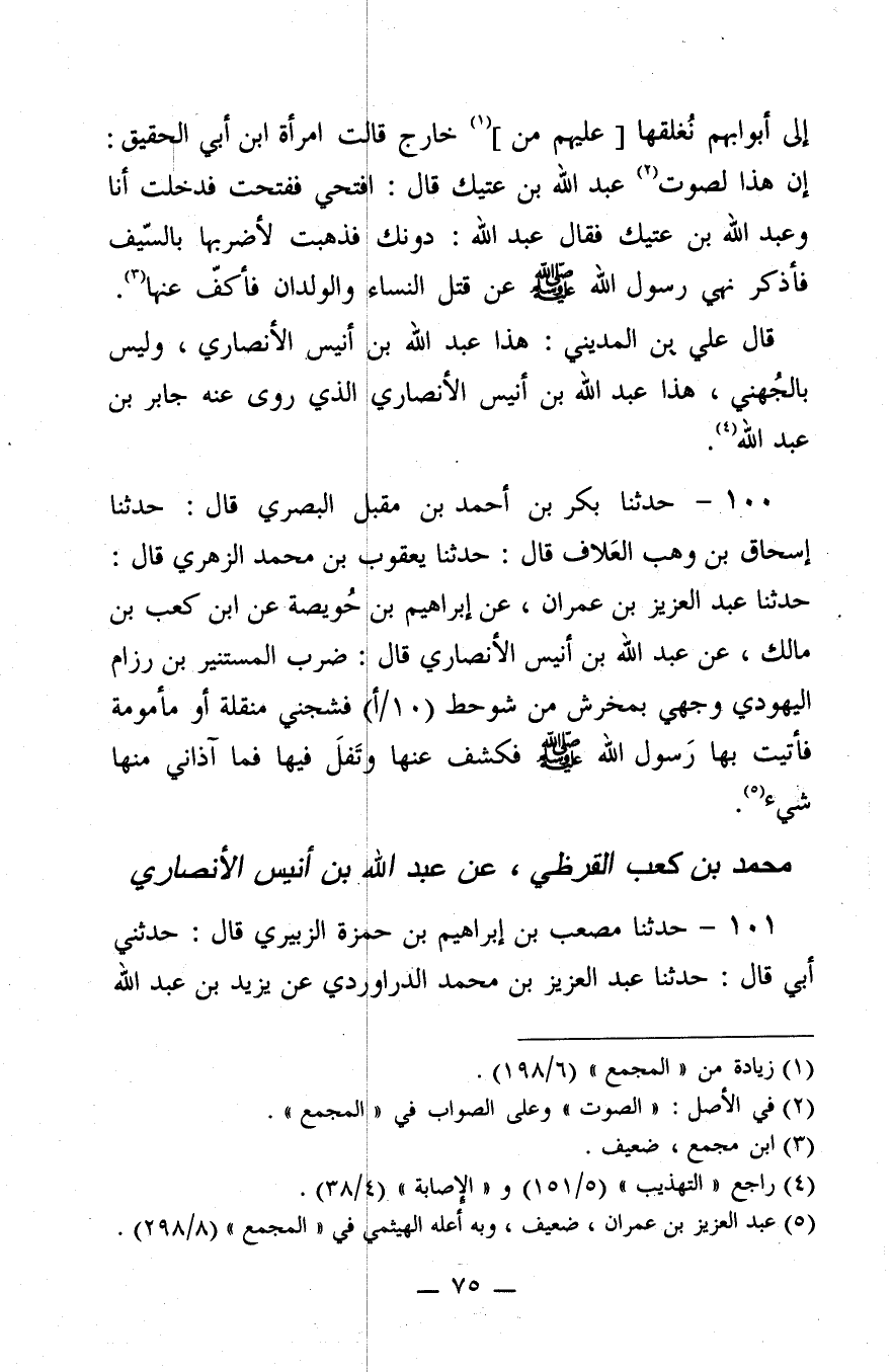 100 - حَدَّثَنَا بَكْرُ بن أَحْمَدَ بن مُقْبِلٍ الْبَصْرِيُّ، قَالَ: حَدَّثَنَا إِسْحَاقُ بن وَهْبٍ الْعَلافُ، قَالَ: حَدَّثَنَا يَعْقُوبُ بن مُحَمَّدٍ الزُّهْرِيُّ، قَالَ: حَدَّثَنَا عَبْدُ الْعَزِيزِ بن عُمَرَانَ، عَنْ إِبْرَاهِيمَ بن حُوَيْصَةَ، عَنِ ابْنِ كَعْبِ بن مَالِكٍ، عَنْ عَبْدِ اللَّهِ بن أُنَيْسٍ الأَنْصَارِيِّ، قَالَ:"ضَرَبَ الْمُسْتَنِيرُ بن رِزَامٍ الْيَهُودِيُّ وَجْهِي بِمِخْرَشٍ مَنْ شَوْحَطٍ، فَشَجَّنِي مَنْقَلَةً، أَوْ مَأْمُومَةً، فَأَتَيْتُ بِهَا رَسُولَ اللَّهِ صَلَّى اللَّهُ عَلَيْهِ وَسَلَّمَ، فَكَشَفَ عَنْهَا، وَتَفَلَ فِيهَا فَمَا آذَانِي مِنْهَا شَيْءٌ".