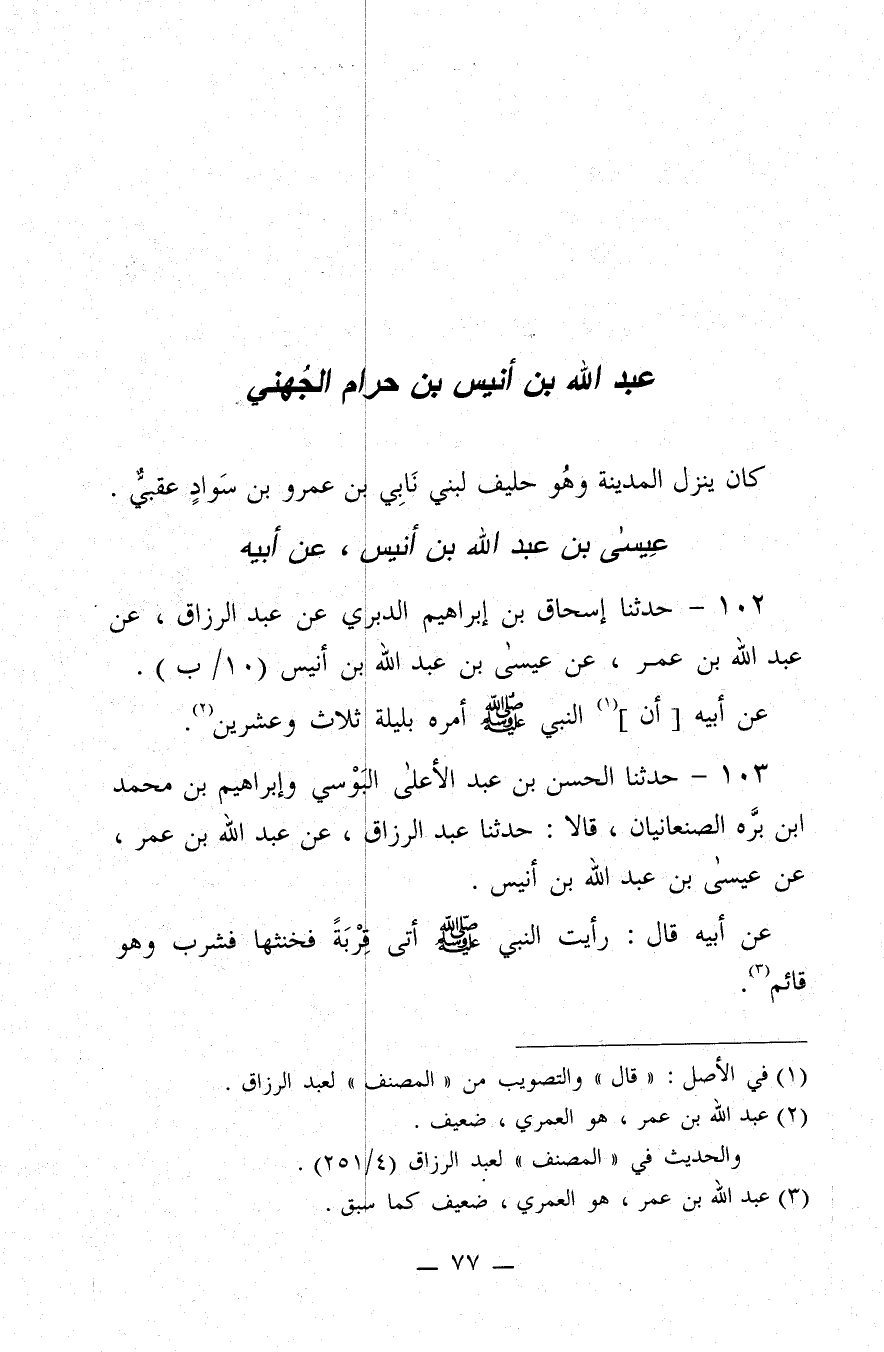 102 - حَدَّثَنَا إِسْحَاقُ بن إِبْرَاهِيمَ الدَّبَرِيُّ، عَنْ عَبْدِ الرَّزَّاقِ، عَنْ عَبْدِ اللَّهِ بن عُمَرَ، عَنْ عِيسَى بن عَبْدِ اللَّهِ بن أُنَيْسٍ، عَنْ أَبِيهِ،"أَنّ النَّبِيَّ صَلَّى اللَّهُ عَلَيْهِ وَسَلَّمَ أَمَرَهُ بِلَيْلَةِ ثَلاثٍ وَعِشْرِينَ".