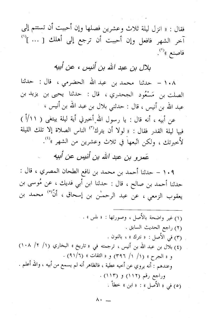 108 - حَدَّثَنَا مُحَمَّدُ بن عَبْدِ اللَّهِ الْحَضْرَمِيُّ، قَالَ: حَدَّثَنَا الصَّلْتُ بن مَسْعُودٍ الْجَحْدَرِيُّ، قَالَ: حَدَّثَنَا يَحْيَى بن يَزِيدَ بن عَبْدِ اللَّهِ بن أُنَيْسٍ، قَالَ: حَدَّثَنِي بِلالُ بن عَبْدِ اللَّهِ بن أُنَيْسٍ، عَنْ أَبِيهِ، أَنَّهُ قَالَ: يَا رَسُولَ اللَّهِ أَخْبَرَنِي أَيَّةَ لَيْلَةٍ يُبْتَغَى فِيهَا لَيْلَةُ الْقَدْرِ، فَقَالَ:"لَوْلا أَنْ يَتْرُكَ النَّاسُ الصَّلاةَ، إِلا تِلْكَ اللَّيْلَةَ لأَخْبَرْتُكَ، وَلَكِنِ اتَّبِعْهَا فِي ثَلاثٍ وَعِشْرِينَ مِنَ الشَّهْرِ".
