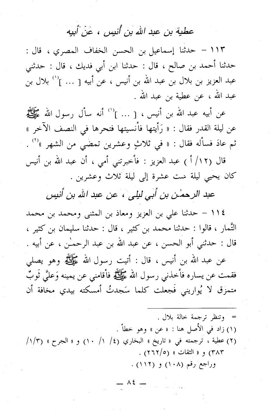 113 - حَدَّثَنَا إِسْمَاعِيلُ بن الْحَسَنِ الْخَفَّافُ الْمِصْرِيُّ، قَالَ: حَدَّثَنَا أَحْمَدُ بن صَالِحٍ، قَالَ: حَدَّثَنَا ابْنُ أَبِي فُدَيْكٍ، قَالَ: حَدَّثَنِي عَبْدُ الْعَزِيزِ بن بِلالِ بن عَبْدِ اللَّهِ بن أُنَيْسٍ، عَنْ أَبِيهِ... بِلالُ بن عَبْدِ اللَّهِ، عَنْ عَطِيَّةَ بن عَبْدِ اللَّهِ، عَنْ أَبِيهِ عَبْدِ اللَّهِ بن أُنَيْسٍ،...، أَنَّهُ سَأَلَ رَسُولَ اللَّهِ صَلَّى اللَّهُ عَلَيْهِ وَسَلَّمَ عَنْ لَيْلَةِ الْقَدْرِ، فَقَالَ:"رَأَيْتُهَا، فَأُنْسِيتُهَا، فَتَحَرَّهَا فِي النِّصْفِ الآخِرِ"، ثُمَّ عَادَ فَسَأَلَهُ، فَقَالَ:"فِي ثَلاثٍ وَعِشْرِينَ تَمْضِي مِنَ الشَّهْرِ". قَالَ عَبْدُ الْعَزِيزِ: فَأَخْبَرَتْنِي أُمِّي، أَنَّ عَبْدَ اللَّهِ بن أُنَيْسٍ كَانَ يُحْيِي لَيْلَةَ سِتَّ عَشْرَةَ لَيْلَةً إِلَى لَيْلَةِ ثَلاثٍ وَعِشْرِينَ.