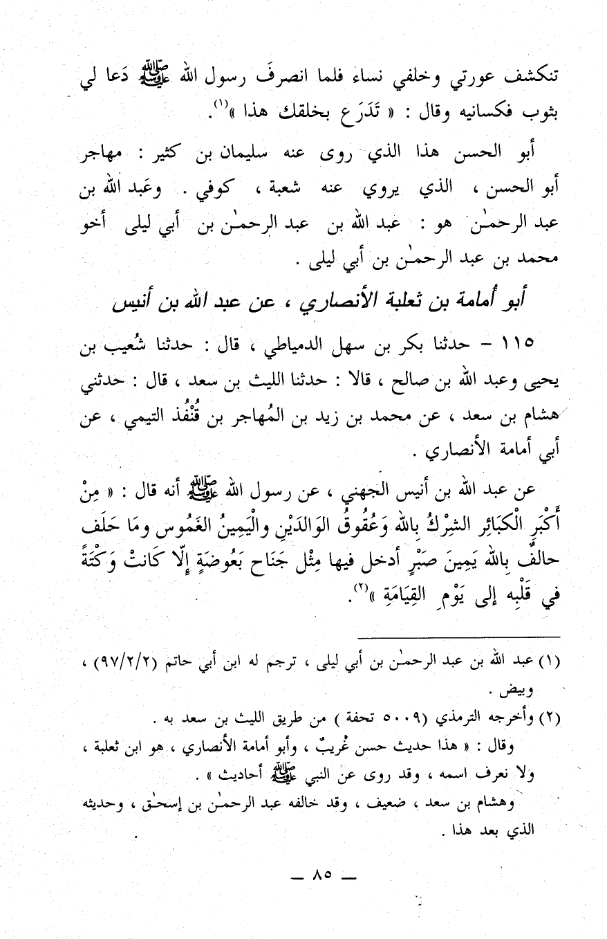 115 - حَدَّثَنَا بَكْرُ بن سَهْلٍ الدِّمْيَاطِيُّ، قَالَ: حَدَّثَنَا شُعَيْبُ بن يَحْيَى، وَعَبْدُ اللَّهِ بن صَالِحٍ، قَالا: حَدَّثَنَا اللَّيْثُ بن سَعْدٍ، قَالَ: حَدَّثَنِي هِشَامُ بن سَعْدٍ، عَنْ مُحَمَّدِ بن زَيْدِ بن الْمُهَاجِرِ بن قُنْفُذٍ التَّيْمِيِّ، عَنْ أَبِي أُمَامَةَ الأَنْصَارِيِّ، عَنْ عَبْدِ اللَّهِ بن أُنَيْسٍ الْجُهَنِيِّ، عَنْ رَسُولِ اللَّهِ صَلَّى اللَّهُ عَلَيْهِ وَسَلَّمَ، أَنَّهُ قَالَ:"منْ أَكْبَرِ الْكَبَائِرِ الشِّرْكُ بِاللَّهِ، وَعُقُوقُ الْوَالِدَيْنِ، وَالْيَمِينُ الْغَمُوسُ، وَمَا حَلَفَ حَالِفٌ بِاللَّهِ يَمِينَ صَبْرٍ أَدْخَلَ فِيهَا مِثْلَ جَنَاحَ بَعُوضَةٍ، إِلا كَانَتْ وَكْتَةً فِي قَلْبِهِ إِلَى يَوْمِ الْقِيَامَةِ".@