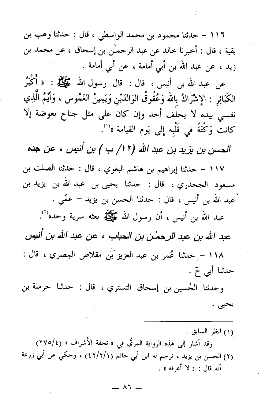 116 - حَدَّثَنَا مَحْمُودُ بن مُحَمَّدٍ الْوَاسِطِيُّ، قَالَ: حَدَّثَنَا وَهْبُ بن بَقِيَّةَ، قَالَ: أَخْبَرَنَا خَالِدٌ، عَنْ عَبْدِ الرَّحْمَنِ بن إِسْحَاقَ، عَنْ مُحَمَّدِ بن زَيْدٍ، عَنْ عَبْدِ اللَّهِ بن أَبِي أُمَامَةَ، عَنْ أَبِي أُمَامَةَ، عَنْ عَبْدِ اللَّهِ بن أُنَيْسٍ، قَالَ: قَالَ رَسُولُ اللَّهِ صَلَّى اللَّهُ عَلَيْهِ وَسَلَّمَ:"أَكْبَرُ الْكَبَائِرِ: الإِشْرَاكُ بِاللَّهِ، وَعُقُوقُ الْوَالِدَيْنِ، وَيَمِينُ الْغَمُوسِ، وَأَيْمُ الَّذِي نَفْسِي بِيَدِهِ، لا يَحْلِفُ أَحَدٌ وَإِنْ كَانَ عَلَى مِثْلِ جَنَاحِ بَعُوضَةٍ، إِلا كَانَتْ وَكْتَةً فِي قَلْبِهِ إِلَى يَوْمِ الْقِيَامَةِ"