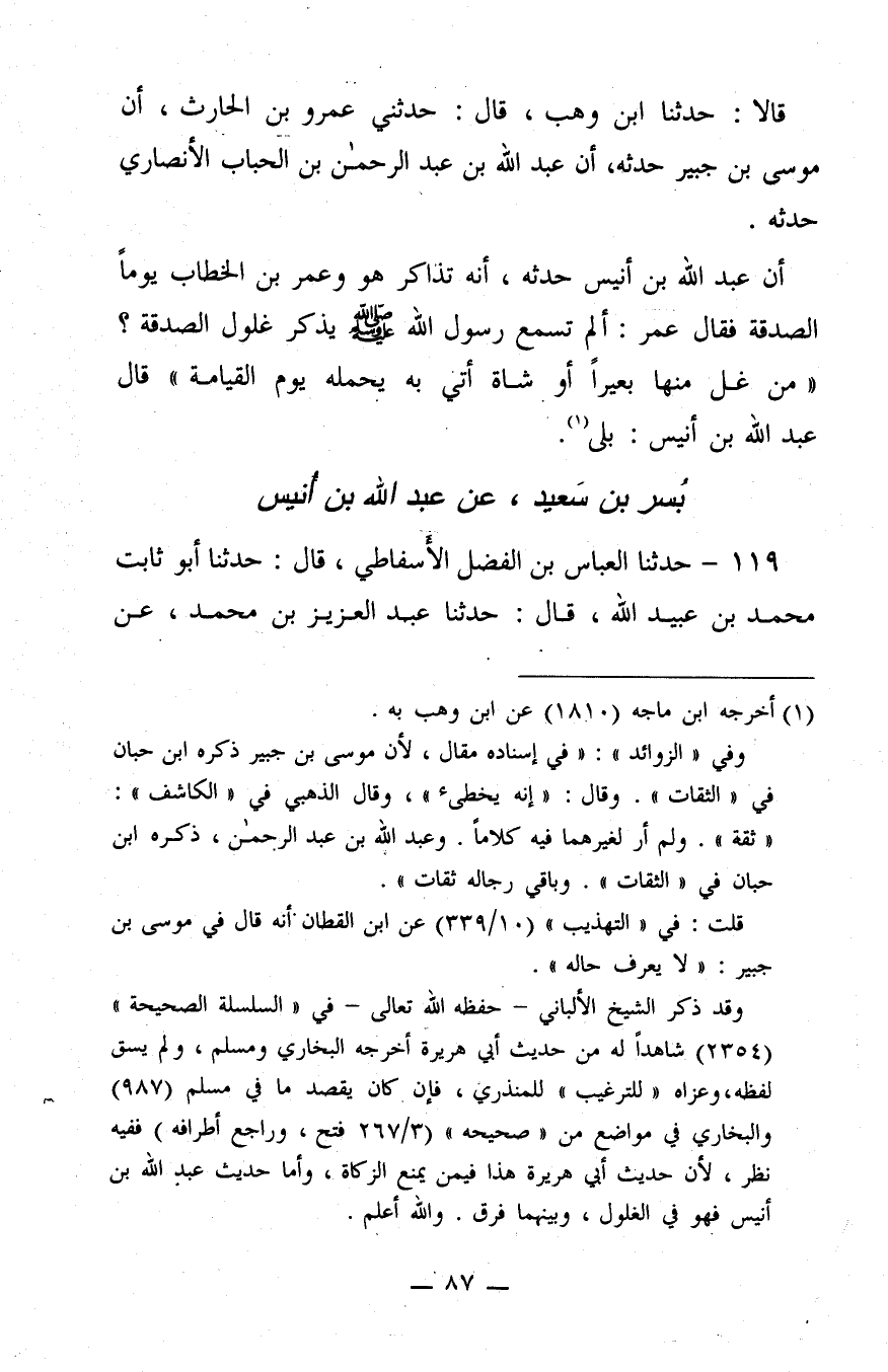 قَالا: حَدَّثَنَا ابْنُ وَهْبٍ، قَالَ: حَدَّثَنِي عَمْرُو بن الْحَارِثِ، أَنَّ مُوسَى بن جُبَيْرٍ حَدَّثَهُ، أَنَّ عَبْدَ اللَّهِ بن عَبْدِ الرَّحْمَنِ بن الُحُبَابِ الأَنْصَارِيَّ حَدَّثَهُ، أَنَّ عَبْدَ اللَّهِ بن أُنَيْسٍ حَدَّثَهُ، أَنَّهُ تَذَاكَرَ هُوَ وَعُمَرُ بن الْخَطَّابِ يَوْمًا الصَّدَقَةَ، فَقَالَ عُمَرُ: أَلَمْ تَسْمَعْ رَسُولَ اللَّهِ صَلَّى اللَّهُ عَلَيْهِ وَسَلَّمَ يَذْكُرُ غُلُولَ الصَّدَقَةِ؟"مَنْ غَلَّ مِنْهَا بَعِيرًا أَوْشاةً، أُتِيَ بِهِ يَحْمِلُهُ يَوْمَ الْقِيَامَةِ". قَالَ عَبْدُ اللَّهِ بن أُنَيْسٍ: بَلَى.