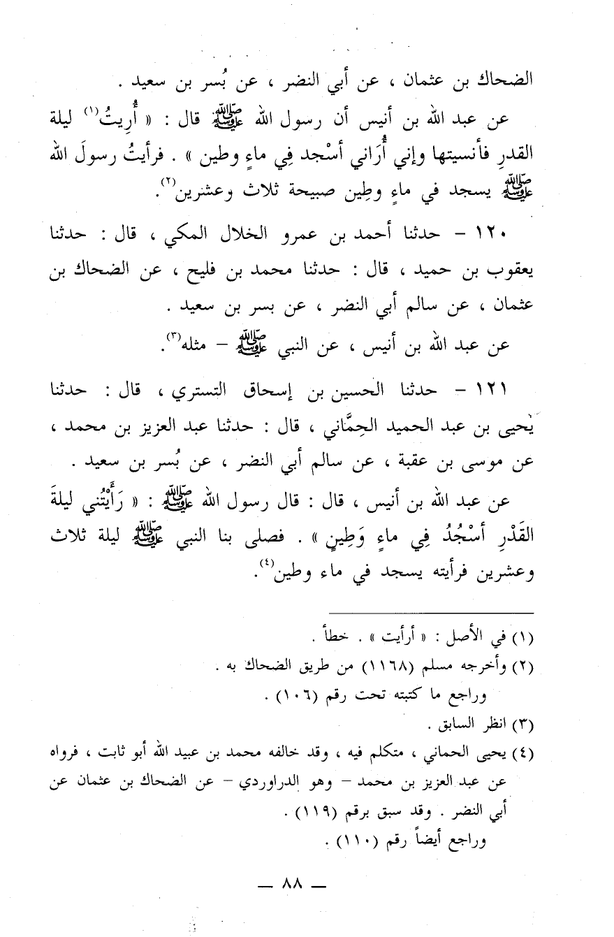 121 - حَدَّثَنَا الْحُسَيْنُ بن إِسْحَاقَ التُّسْتَرِيُّ، قَالَ: حَدَّثَنَا يَحْيَى بن عَبْدِ الْحَمِيدِ الْحَمَّانِيُّ، قَالَ: حَدَّثَنَا عَبْدُ الْعَزِيزِ بن مُحَمَّدٍ، عَنْ مُوسَى بن عُقْبَةَ، عَنْ سَالِمٍ أَبِي النَّضْرِ، عَنْ بُسْرِ بن سَعِيدٍ، عَنْ عَبْدِ اللَّهِ بن أُنَيْسٍ، قَالَ: قَالَ رَسُولُ اللَّهِ صَلَّى اللَّهُ عَلَيْهِ وَسَلَّمَ:"رَأَيْتُنِي لَيْلَةَ الْقَدْرِ أَسْجُدُ فِي مَاءٍ وَطِينٍ". فَصَلَّى بنا النَّبِيُّ لَيْلَةَ ثَلاثٍ وَعِشْرِينَ، فَرَأَيْتُهُ يَسْجُدُ فِي مَاءٍ وَطِينٍ.@