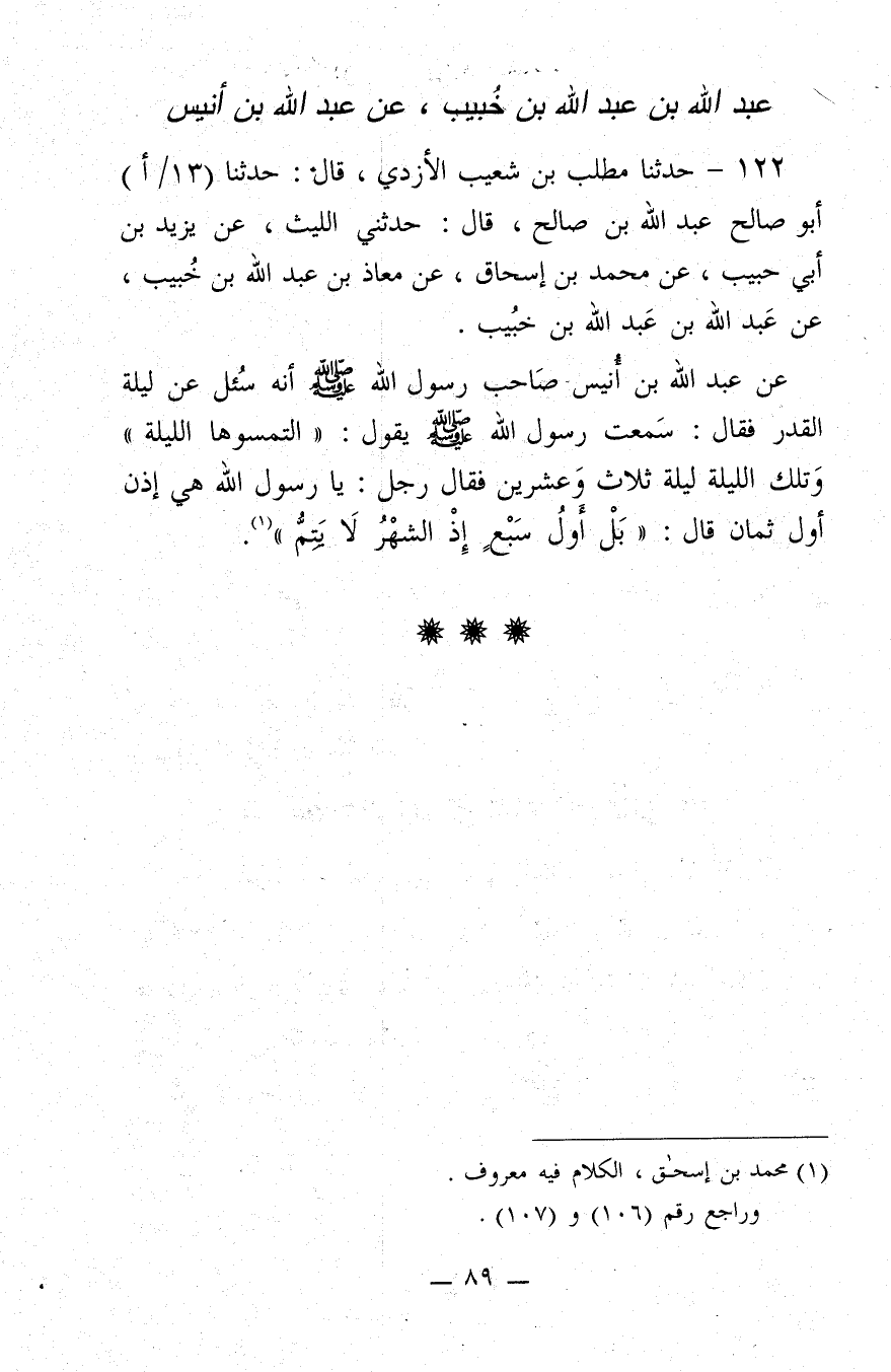 122 - حَدَّثَنَا مُطَّلِبُ بن شُعَيْبٍ الأَزْدِيُّ، قَالَ: حَدَّثَنَا أَبُو صَالِحٍ عَبْدُ اللَّهِ بن صَالِحٍ، قَالَ: حَدَّثَنِي اللَّيْثُ، عَنْ يَزِيدَ بن أَبِي حَبِيبٍ، عَنْ مُحَمَّدِ بن إِسْحَاقَ، عَنْ مُعَاذِ بن عَبْدِ اللَّهِ بن خُبَيْبٍ، عَنْ عَبْدِ اللَّهِ بن عَبْدِ اللَّهِ بن خُبَيْبٍ، عَنْ عَبْدِ اللَّهِ بن أُنَيْسٍ صَاحِبِ رَسُولِ اللَّهِ صَلَّى اللَّهُ عَلَيْهِ وَسَلَّمَ أَنَّهُ سُئِلَ عَنْ لَيْلَةِ الْقَدْرِ، فَقَالَ: سَمِعْتُ رَسُولَ اللَّهِ صَلَّى اللَّهُ عَلَيْهِ وَسَلَّمَ، يَقُولُ:"الْتَمِسُوهَا اللَّيْلَةَ، وَتِلْكَ اللَّيْلَةُ لَيْلَةُ ثَلاثٍ وَعِشْرِينَ، فَقَالَ رَجُلٌ: يَا رَسُولَ اللَّهِ، هِيَ إِذَنْ أَوَّلُ ثَمَانٍ، قَالَ:"بَلْ أَوَّلُ سَبْعٍ إِذِ الشَّهْرُ لا يَتِمُّ".@