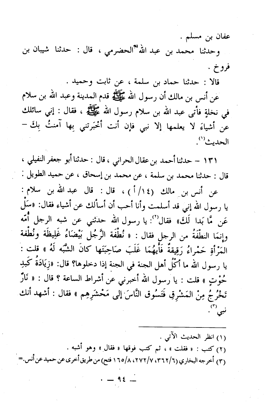 عَفَّانُ بن مُسْلِمٍ، وَحَدَّثَنَا مُحَمَّدُ بن عَبْدِ اللَّهِ الْحَضْرَمِيُّ، قَالَ: حَدَّثَنَا شَيْبَانُ بن فَرُّوخٍ، قَالا: حَدَّثَنَا حَمَّادُ بن سَلَمَةَ، عَنْ ثَابِتٍ، وَحُمَيْدٍ، عَنْ أَنَسِ بن مَالِكٍ، أَنّ رَسُولَ اللَّهِ صَلَّى اللَّهُ عَلَيْهِ وَسَلَّمَ قَدِمَ الْمَدَينَةَ، وَعَبْدُ اللَّهِ بن سَلامٍ فِي نَخْلَةٍ، فَأَتَى عَبْدُ اللَّهِ بن سَلامٍ رَسُولَ اللَّهِ صَلَّى اللَّهُ عَلَيْهِ وَسَلَّمَ، فَقَالَ:"إِنِّي سَائِلُكَ عَنْ أَشْيَاءَ لا يَعْلَمُهَا إِلا نَبِيُّ، فَإِنْ أَنْتَ أَخْبَرْتَنِي بِهَا آمَنْتُ بِكَ..."الْحَدِيثُ حَدَّثَنَا أَحْمَدُ بن عِقَالٍ الْحَرَّانِيُّ، قَالَ: حَدَّثَنَا أَبُو جَعْفَرٍ النُّفَيْلِيُّ، قَالَ: حَدَّثَنَا مُحَمَّدُ بن سَلَمَةَ، عَنْ مُحَمَّدِ بن إِسْحَاقَ، عَنْ حُمَيْدٍ الطَّوِيلِ، عَنْ أَنَسِ بن مَالِكٍ، قَالَ: قَالَ عَبْدُ اللَّهِ بن سَلامٍ: يَا رَسُولَ اللَّهِ، إِنِّي قَدْ أَسْلَمْتُ وَأَنَا أُحِبُّ أَنْ أَسْأَلَكَ عَنْ أَشْيَاءَ، فَقَالَ:"سَلْ عَنْ مَا بَدَا لَكَ"، فَقَالَ: يَا رَسُولَ اللَّهِ حَدَّثَنِي عَنْ شَبَهِ الرَّجُلِ أُمَّهَ، وَإِنَّمَا النُّطْفَةُ مِنَ الرَّجُلِ، فَقَالَ:"نُطْفَةُ الرَّجُلِ بَيْضَاءُ غَلِيَظَةٌ، وَنُطْفَةُ الْمَرْأَةِ حَمْرَاءُ رِقُيْقَةٌ، فَأَيُّهُمَا غَلَبَ صَاحِبَتَهَا كَانَ الشَّبَهُ لَهُ".