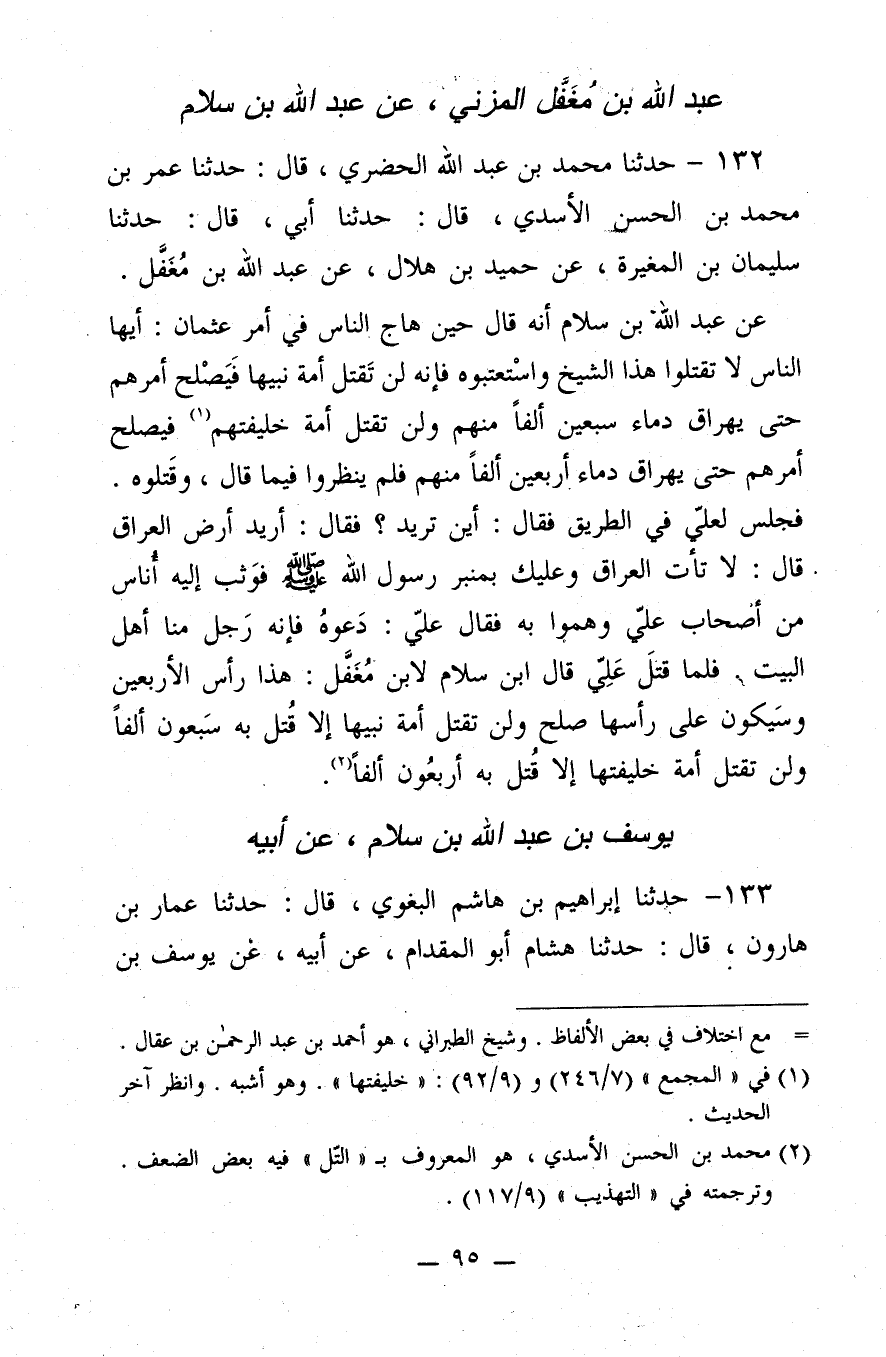 132 - حَدَّثَنَا مُحَمَّدُ بن عَبْدِ اللَّهِ الْحَضَرِيُّ، قَالَ: حَدَّثَنَا عُمَرُ بن مُحَمَّدِ بن الْحَسَنِ الأَسَدِيُّ، قَالَ: حَدَّثَنَا أَبِي، قَالَ: حَدَّثَنَا سُلَيْمَانُ بن الْمُغِيرَةِ، عَنْ حُمَيْدِ بن هِلالٍ، عَنْ عَبْدِ اللَّهِ بن مُغَفَّلٍ، عَنْ عَبْدِ اللَّهِ بن سَلامٍ، أَنَّهُ قَالَ حِينَ هَاجَ النَّاسُ فِي أَمْرِ عُثْمَانَ:"أَيُّهَا النَّاسُ لا تَقْتُلُوا هَذَا الشَّيْخَ، وَاسْتَعْتِبُوهُ، فَإِنَّهُ لَنْ تَقْتُلَ أُمَّةٌ نَبِيَّهَا فَيَصْلُحَ أَمْرُهُمْ، حَتَّى يُهْرَاقَ دِمَاءُ سَبْعِينَ أَلْفًا مِنْهُمْ، وَلَنْ تَقْتُلَ أُمَّةً خَلِيفَتَهُمْ فَيَصْلُحَ أَمْرُهُمْ، حَتَّى يُهْرَاقَ دِمَاءُ أَرْبَعِينَ أَلْفًا مِنْهُمْ"، فَلَمْ يَنْظُرُوا فِيمَا قَالَ، وَقَتَلُوهُ، فَجَلَسَ لِعَلِيٍّ فِي الطَّرِيقِ، فَقَالَ:"أَيْنَ تُرِيدُ؟"فَقَالَ: أُرِيدُ أَرْضَ الْعِرَاقِ، قَالَ:"لا تَأْتِ الْعِرَاقَ، وَعَلَيْكَ بِمِنْبَرِ رَسُولِ اللَّهِ صَلَّى اللَّهُ عَلَيْهِ وَسَلَّمَ"، فَوَثَبَ إِلَيْهِ أُنَاسٍ مِنْ أَصْحَابِ عَلِيٍّ، وَهَمُّوا بِهِ، فَقَالَ عَلِيٌّ: دَعُوهُ فَإِنَّهُ رَجُلٌ مِنَّا أَهْلِ الْبَيْتِ، فَلَمَّا قُتِلَ عَلِيٌّ، قَالَ ابْنُ سَلامٍ لابْنِ مُغَفَّلٍ:"هَذَا رَأْسُ الأَرْبَعِينَ، وَسَيَكُونُ عَلَى رَأْسِهَا صُلْحٌ، وَلَنْ تَقْتُلَ أُمَّةٌ نَبِيَّهَا إِلا قُتِلَ بِهِ سَبْعُونَ أَلْفًا، وَلَنْ تَقْتُلَ أُمَّةٌ خَلِيفَتَهَا إِلا قُتِلَ بِهِ أَرْبَعُونَ أَلْفًا"