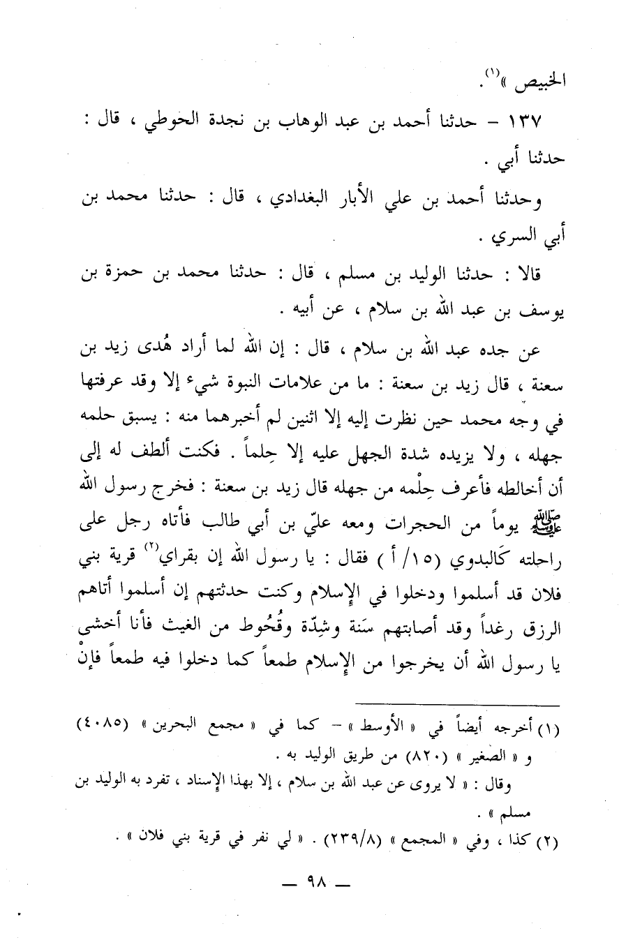 137 - حَدَّثَنَا أَحْمَدُ بن عَبْدِ الْوَهَّابِ بن نَجْدَةَ الْحُوطِيُّ، قَالَ: حَدَّثَنِي أَبِي، وَحَدَّثَنَا أَحْمَدُ بن عَلِيٍّ الأَبَّارُ الْبَغْدَادِيُّ، قَالَ: حَدَّثَنَا مُحَمَّدُ بن أَبِي السَّرِيِّ، قَالا: حَدَّثَنَا الْوَلِيدُ بن مُسْلِمٍ، قَالَ: حَدَّثَنَا مُحَمَّدُ بن حَمْزَةَ بن يُوسُفَ بن عَبْدِ اللَّهِ بن سَلامٍ، عَنْ أَبِيهِ، عَنْ جَدِّهِ عَبْدِ اللَّهِ بن سَلامٍ، قَالَ:"إِنَّ اللَّهَ لَمَّا أَرَادَ هُدَى زَيْدِ بن سَعْنَةَ، قَالَ زَيْدُ بن سَعْنَةَ: مَا مِنْ عَلامَاتِ النُّبُوَّةِ شَيْءٌ إِلا وَقَدْ عَرَفْتُهَا فِي وَجْهِ مُحَمَّدٍ حِينَ نَظَرْتُ إِلَيْهِ، إِلا اثْنَيْنِ لَمْ أُخْبَرْهُمَا مِنْهُ: يَسْبِقُ حِلْمُهُ جَهْلَهُ، وَلا يَزِيدُهُ شِدَّةُ الْجَهْلِ عَلَيْهِ إِلا حِلْمًا، فَكُنْتُ أَلْطَفُ لَهُ إِلَى أَنْ أُخَالِطَهُ، فَأَعْرِفَ حِلْمَهُ مِنْ جَهْلِهِ، قَالَ زَيْدُ بن سَعْنَةَ: فَخَرَجَ رَسُولُ اللَّهِ صَلَّى اللَّهُ عَلَيْهِ وَسَلَّمَ يَوْمًا مِنَ الْحُجُرَاتِ، وَمَعَهُ عَلِيُّ بن أَبِي طَالِبٍ، فَأَتَاهُ رَجُلٌ عَلَى رَاحِلَتِهِ كَالْبَدَوِيِّ، فَقَالَ: يَا رَسُولَ اللَّهِ، إِنَّ بِقِرَايَ قَرْيَةَ بني فُلانٍ، قَدْ أَسْلَمُوا وَدَخَلُوا فِي الإِسْلامِ، وَكُنْتُ حَدَّثْتُهُمْ إِنْ أَسْلَمُوا أَتَاهُمُ الرِّزْقُ رَغَدًا، وَقَدْ أَصَابَتْهُمْ سِنَةٌ وَشِدَّةٌ وَقُحُوطٌ مِنَ الْغَيْثِ، فَأَنَا أَخْشَى يَا رَسُولَ اللَّهِ أَنْ يَخْرُجُوا مِنَ الإِسْلامِ طَمَعًا كَمَا دَخَلُوا فِيهِ طَمَعًا، فَإِنْ@