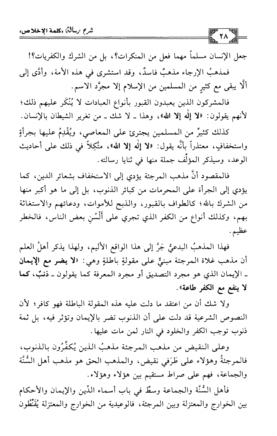 فالمقصود أنَّ مذهب المرجئة يؤدي إلى الاستخفاف بشعائر الدين، كما يؤدي إلى الجرأة على المحرمات من كبائر الذنوب، بل إلى ما هو أكبر منها من الشرك بالله، كالطواف بالقبور، والذبح للأموات، ودعائهم والاستغاثة بهم، وكذلك أنواع من الكفر الذي تجري على أَلْسُنِ بعض الناس، فالخطر عظيم.