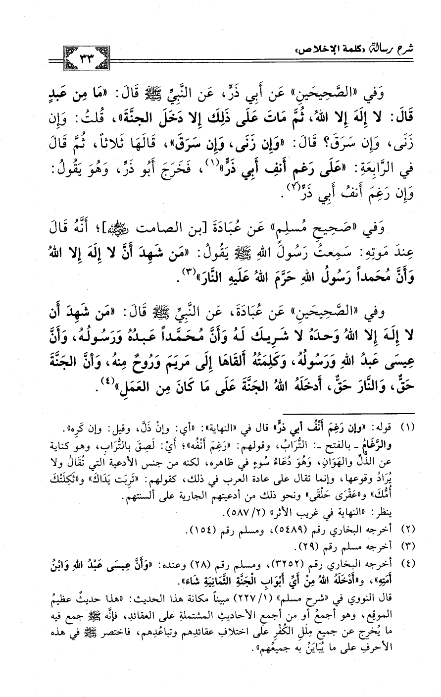 وفي «الصَّحِيحَينِ» عَن عُبَادَةَ عَن النَّبِيِّ صلى الله عليه وسلم قَالَ: «مَن شَهِدَ أَن لا إِلَهَ إِلا اللَّهُ وَحدَهُ لا شَرِيكَ لَهُ وَأَنَّ مُحَمَّداً عَبدُهُ وَرَسُولُهُ، وَأَنَّ عِيسَى عَبدُ اللَّهِ وَرَسُولُهُ، وَكَلِمَتُهُ أَلقَاهَا إِلَى مَريَمَ وَرُوحٌ مِنهُ، وَأنَّ الجَنَّةَ حَقٌّ، وَالنَّارَ حَقٌّ، أَدخَلَهُ اللَّهُ الجَنَّةَ عَلَى مَا كَانَ مِن العَمَلِ» (¬4).
