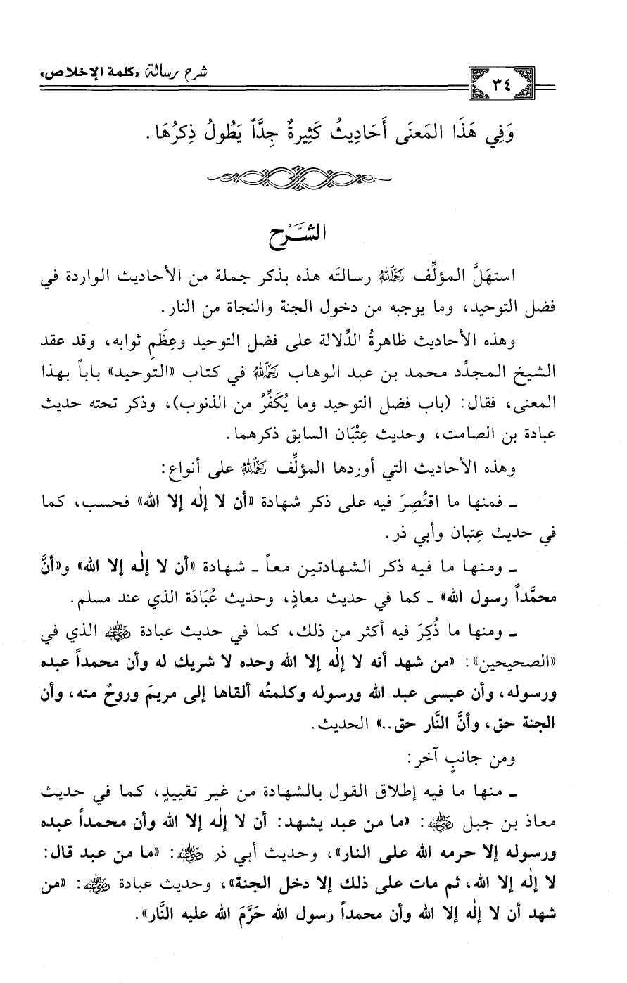 Qاستهَلَّ المؤلِّف -رحمه الله- رسالتَه هذه بذكر جملة من الأحاديث الواردة في فضل التوحيد، وما يوجبه من دخول الجنة والنجاة من النار.