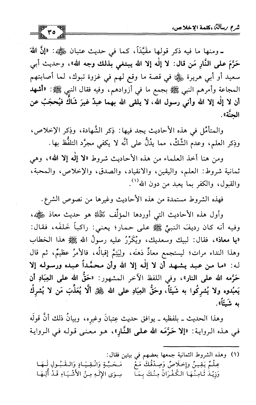 ومن هنا أخذ العلماء من هذه الأحاديث شروط «لا إله إلا الله»، وهي ثمانية شروط: العلم، واليقين، والانقياد، والصدق، والإخلاص، والمحبة، والقبول، والكفر بما يعبد من دون الله (¬1).
