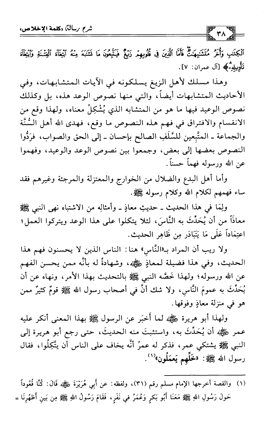 ولِمَا في هذا الحديث - حديثِ معاذٍ - وأمثالِه من الاشتباه نهى النبي صلى الله عليه وسلم معاذَاً من أن يُحَدِّثَ به النَّاسَ، لئلا يتكلوا على هذا الوعد ويتركوا العمل؛ اعتِمَاداً عَلَى مَا يَتَبَادَر مِن ظَاهِر الحديث.