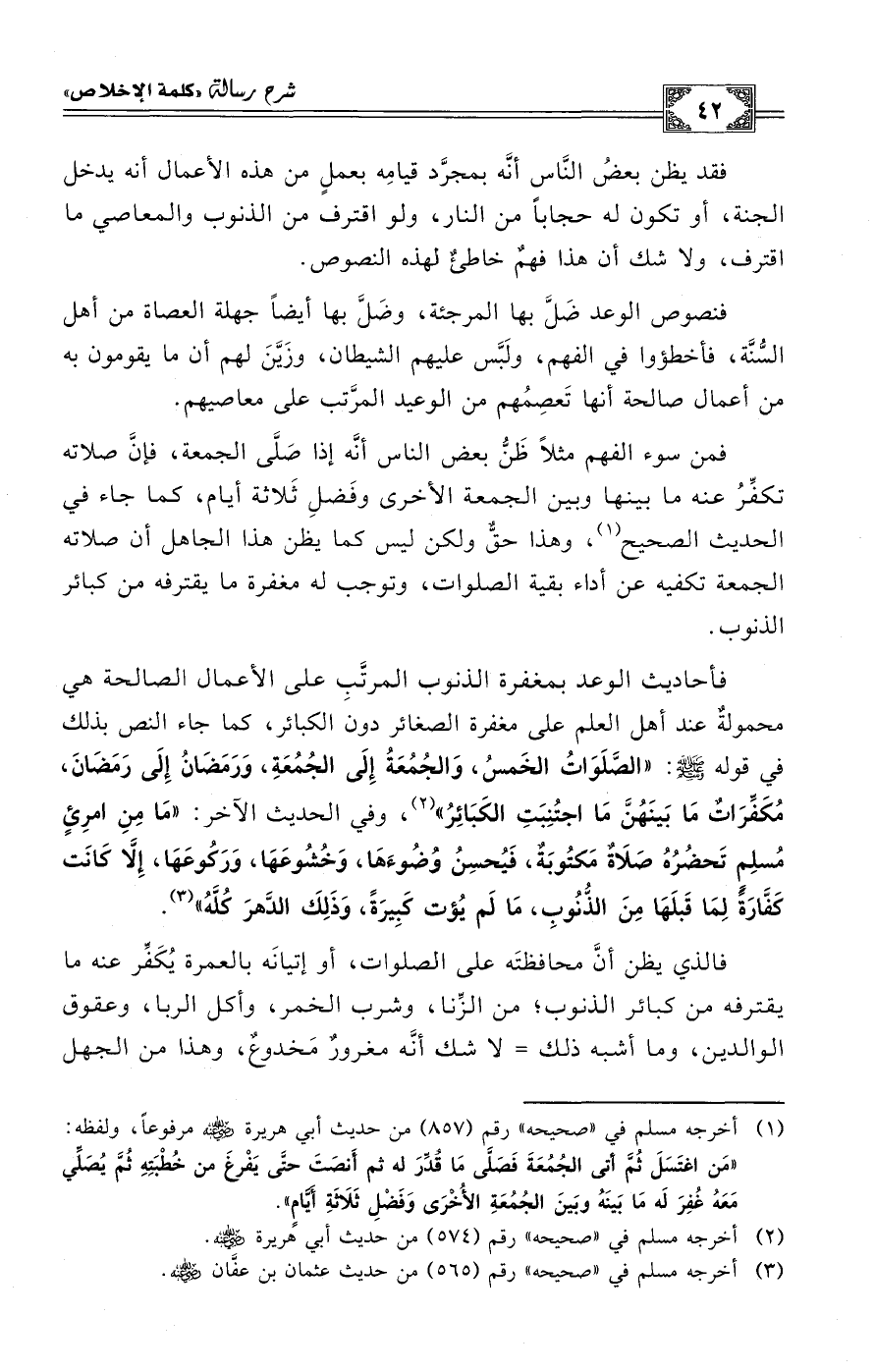 فمن سوء الفهم مثلاً ظَنُّ بعض الناس أنَّه إذا صَلَّى الجمعة، فإنَّ صلاته تكفِّرُ عنه ما بينها وبين الجمعة الأخرى وفَضلِ ثَلاثة أيام، كما جاء في الحديث الصحيح (¬1)، وهذا حقٌّ ولكن ليس كما يظن هذا الجاهل أن صلاته الجمعة تكفيه عن أداء بقية الصلوات، وتوجب له مغفرة ما يقترفه من كبائر الذنوب.