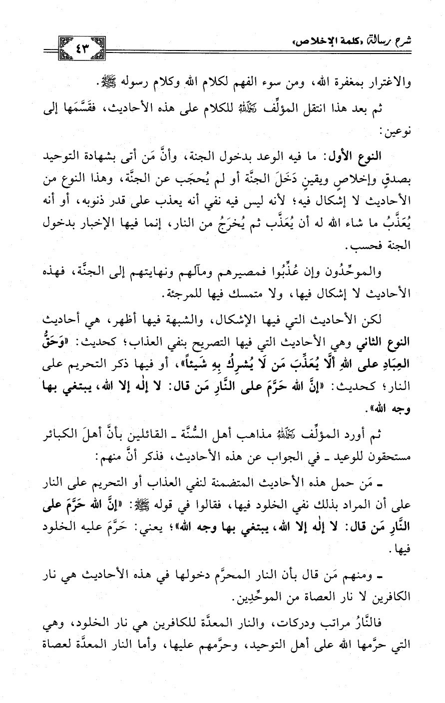 لكن الأحاديث التي فيها الإشكال، والشبهة فيها أظهر، هي أحاديث النوع الثاني وهي الأحاديث التي فيها التصريح بنفي العذاب، كحديث: «وَحَقُّ العِبَادِ على اللهِ ألاَّ يُعَذِّبَ مَن لاَ يُشرِكُ بِهِ شَيئاً»، أو فيها ذكر التحريم على النار، كحديث: «إنَّ الله حَرَّمَ على النَّارِ مَن قال: لا إله إلا الله، يبتغي بها وجه الله».