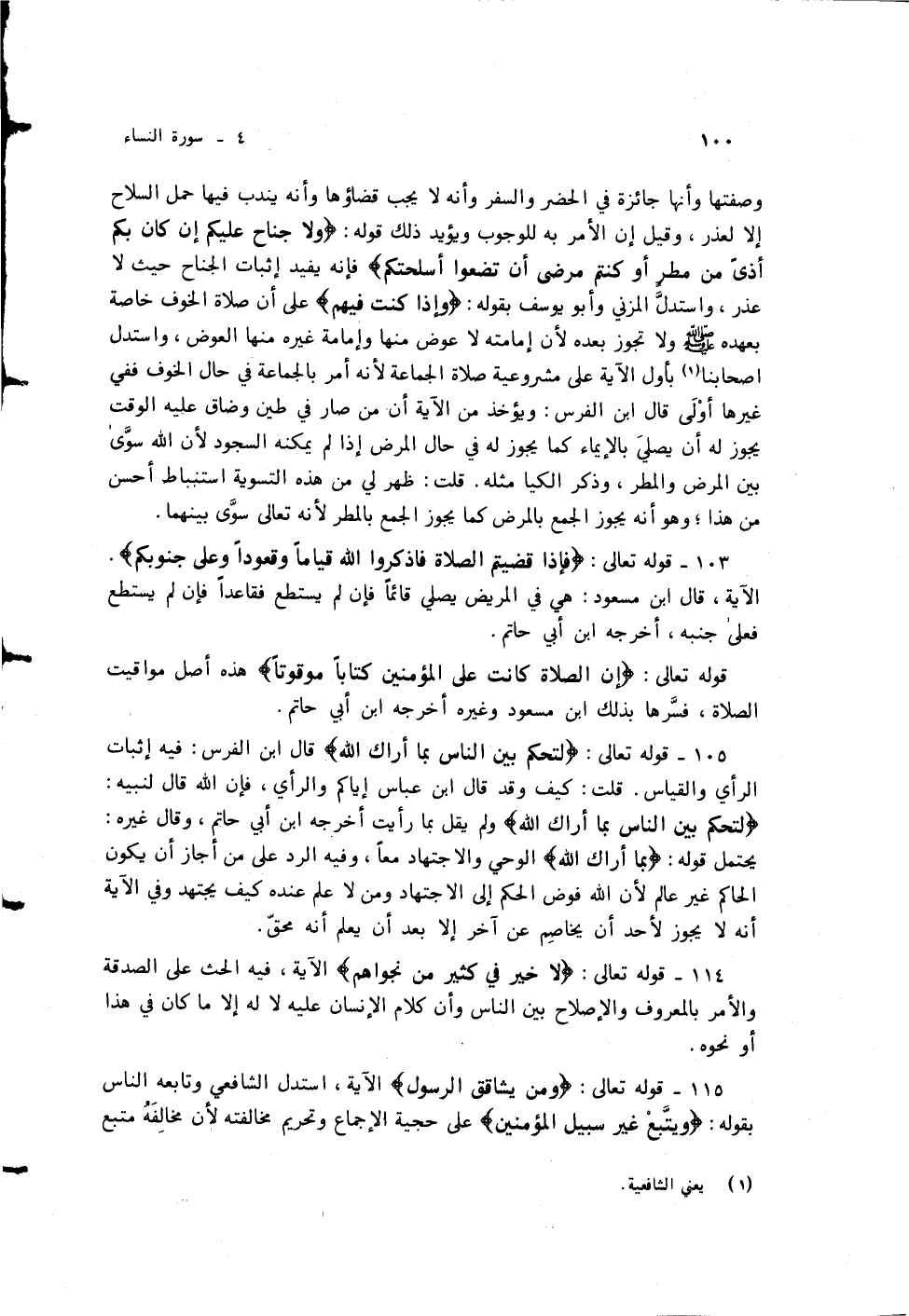 على أن صلاة الخوف خاصة بعهده - صلى الله عليه وسلم - ولا تجوز بعده لانه إمامته لا عوض منها وإمامة غيره منها العوض، واستدل أصحابنا بأول الآية على مشروعية صلاة الجماعة لأنه أمر بالجماعة في حال الخوف ففي غيرها أولى قال ابن الفرس: ويؤخذ من الآية أن من صار في طين وضاق عليه الوقت يجوز له أن يصلي بالإيماء كما يجوز له في حال المرض إذا لم يمكنه السجود لأن الله سوى بين المرض والمطر، وذكر الكيا مثله. قلت: ظهر لي من هذه التسوية استنباط أحسن من هذا؛ وهو ا، هـ يجوز الجمع بالمرض كما يجوز الجمع بالمطر لأنه تعالى سوى بينهما.