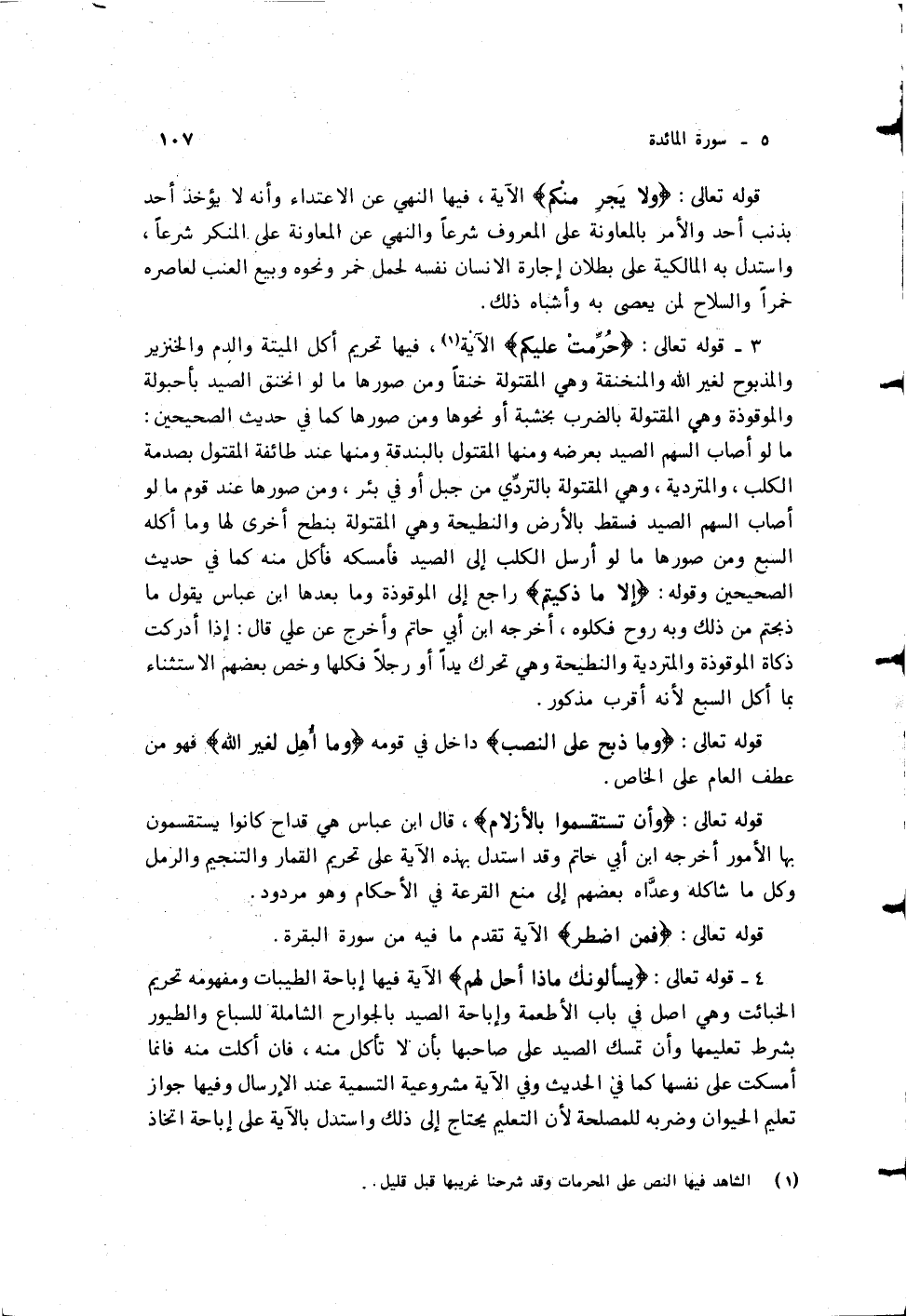 فيها تحريم أكل الميتة والدم والخنزير والمذبوح لغير الله والمنخنقة وهي المقتولة خنقاً ومن صورها ما لو انخنق الصيد بأحبولة والموقوذة وهي المقتولة بالضرب بخشبة أو نحوها ومن صورها كما في حديث الصحيحين: ما لو أصاب السهم الصيد بعرضه ومنها المقتول بالبندقة ومنها عند طائفة المقتول بصدمة الكلب، والمتردية، وهي المقتولة بالتردي من جبل أو في بئر، ومن صورها عند قوم ما لو أصاب السهم الصيد فسقط بالأرض والنطحية وهي المقتولة بنطح أخرى لها وما أكله السبع ومن صورها ما لو أرسل الكلب إلى الصيد فأمسكه فأكر منه كما في حديث الصحيحين وقوله: {إِلَّا مَا ذَكَّيْتُمْ}