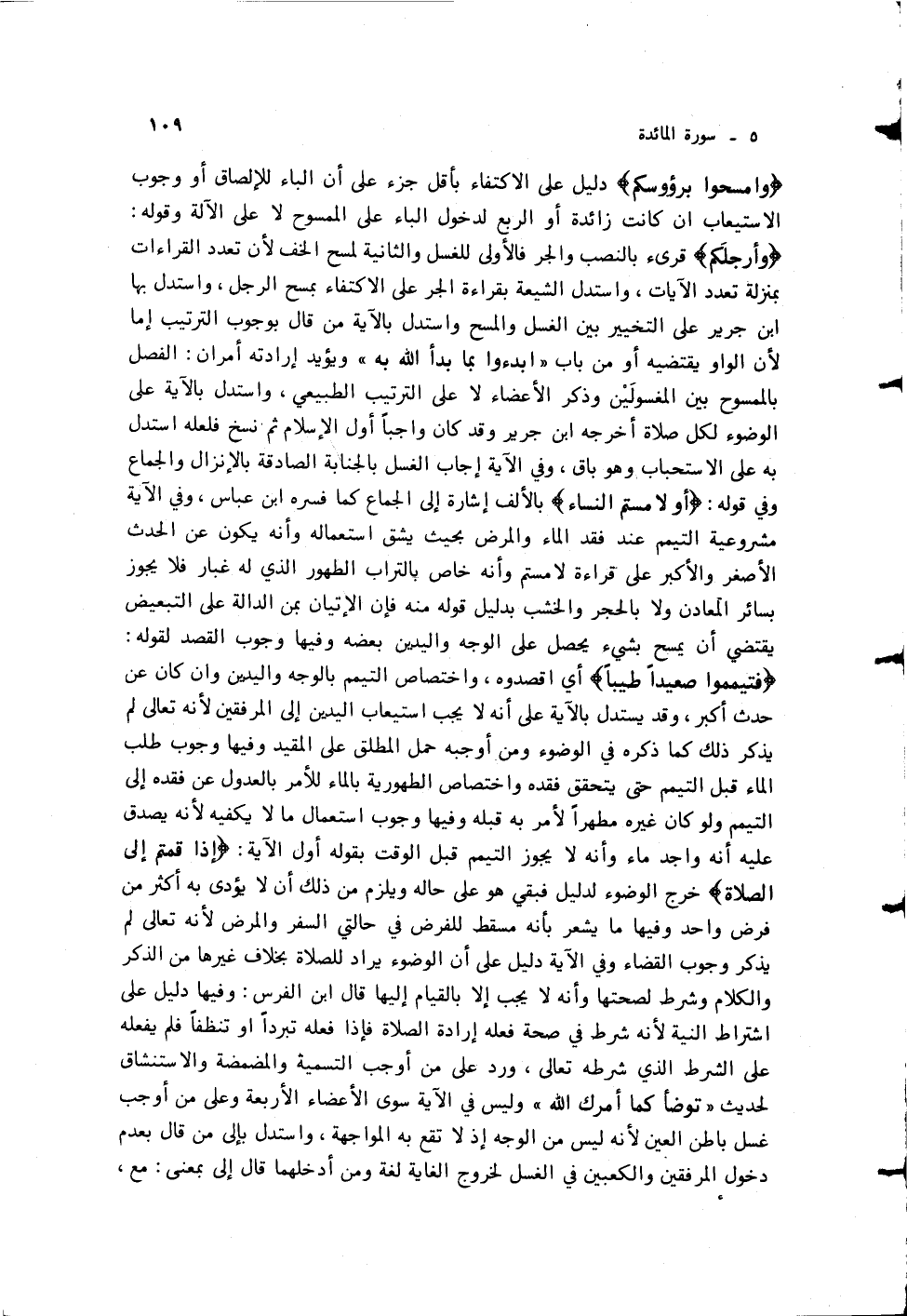 قرئ بالنصب والجر فالأولى للغسل والثانية لمسح الخف لأن تعدد القراءات بمنزلة تعدد الآيات، واستدل الشيعة بقراءة الجر على الاكتفاء بمسح الرجل، واستدل بها ابن جرير على التخيير بين الغسل والمسح واستدل بالآية من قال بوجوب الترتيب إما لأن الواو يقتضيه أو من باب "ابدءوا بما بدأ الله به" ويؤيد إرادته أمران: الفصل بالممسوح بين المغسولين وذكر الأعضاء لا على الترتيب الطبيعي، واستدل بالآية على الوضوء لكل صلاة أخرجه ابن جرير وقد كان واجباً أول الإسلام ثم نسخ فلعله استدل به على الاستحباب وهو باق، وفي الآية إجاب الغسل بالجنابة الصادقة بالإنزال والجماع وفي قوله: {أَوْ لَامَسْتُمُ النِّسَاءَ}