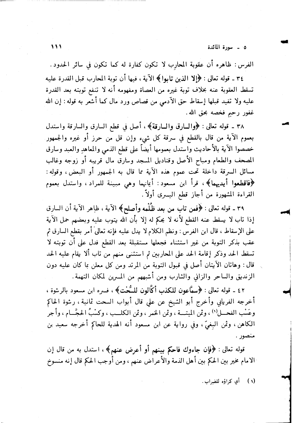 ظاهر الآية أن السارق إذا تاب لا يسقط عنه القطع لأنه لا يحكم له إلا بأن الله يتوب عليع وبعضهم حمل الآية على الإسقاط، قال ابن الفرس: ونظم الكلام لا يدل عليه فإنه تعالى أمر بقطع يد السارق ثم عقب بذكر التوبة من غير استثناء فجعلها مستقبلة بعد القطع فدل على أن توبته لا تسقط الحد وذكر إقامة الحد على المحاربين ثم استثنى منهم من تاب ألا يقام علبه الحد قال: وهاتان الآيتان أصل في قبول التوبة من المرتد ومن كل معلن بما كان عليه دون الزنديق والساحر والزاني والشارب ومن أشبههم من المسرين لمكان التهمة.