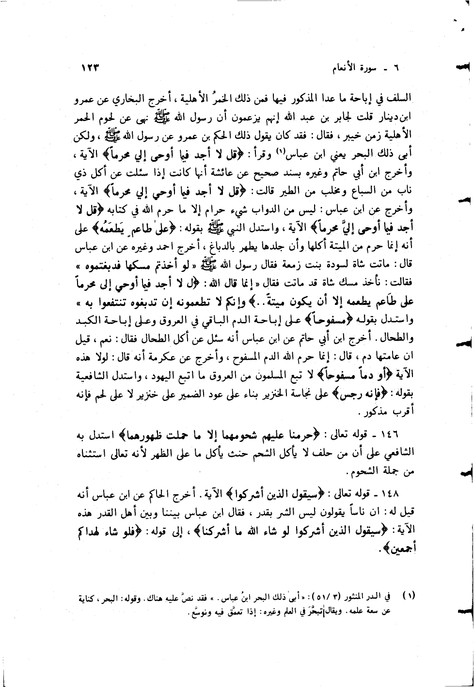 الاية، وأخرج عن ابن عباس: ليس من الدواب شيء حرام إلا ما حرم الله في كتابه {قُلْ لَا أَجِدُ فِي مَا أُوحِيَ إِلَيَّ مُحَرَّمًا} الآية.
