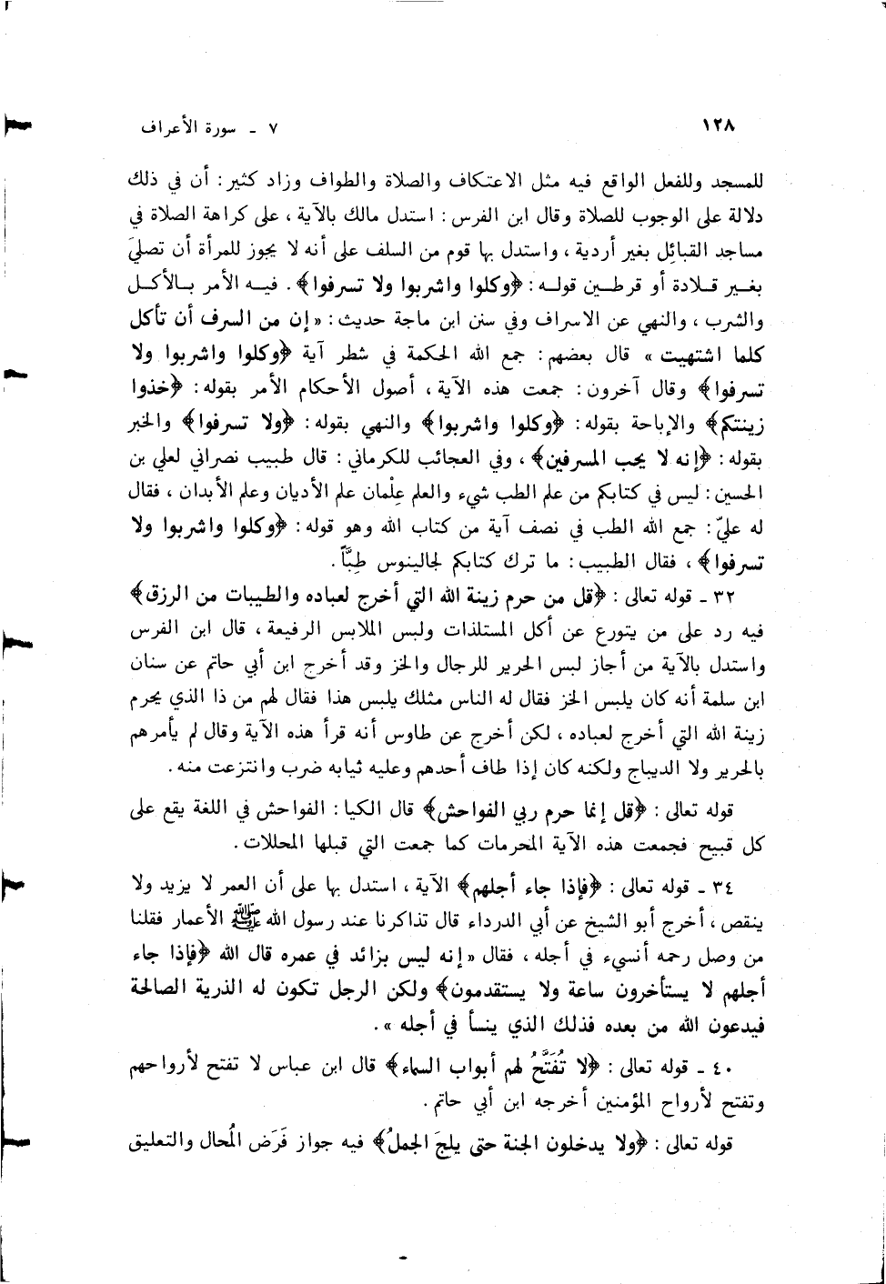 للمسجد وللفعل الواقع فيه مثل الإعتكاف والصلاة والطواف وزاد كثير: أن في ذلك دلالة على الوجوب للصلاة وقال ابن الفرس: استدل مالك بالآية، على كراهة الصلاة في مساجد القبائل بغير أردية، واستدل بها قوم من السلف على أنه لا يجوز للمرأة أن تصلي بغير قلادة أو قرطين قوله: {وَكُلُوا وَاشْرَبُوا وَلَا تُسْرِفُوا} . فيه الأمر بالأكل والشرب، والنهي عن الإسراف ةفي سنن ابن ماجه حديث: "إن من السرف أن تأكل كلما اشتهيت" قال بعضهم: جمع الله الحكمة في شطر آية {وَكُلُوا وَاشْرَبُوا وَلَا تُسْرِفُوا}