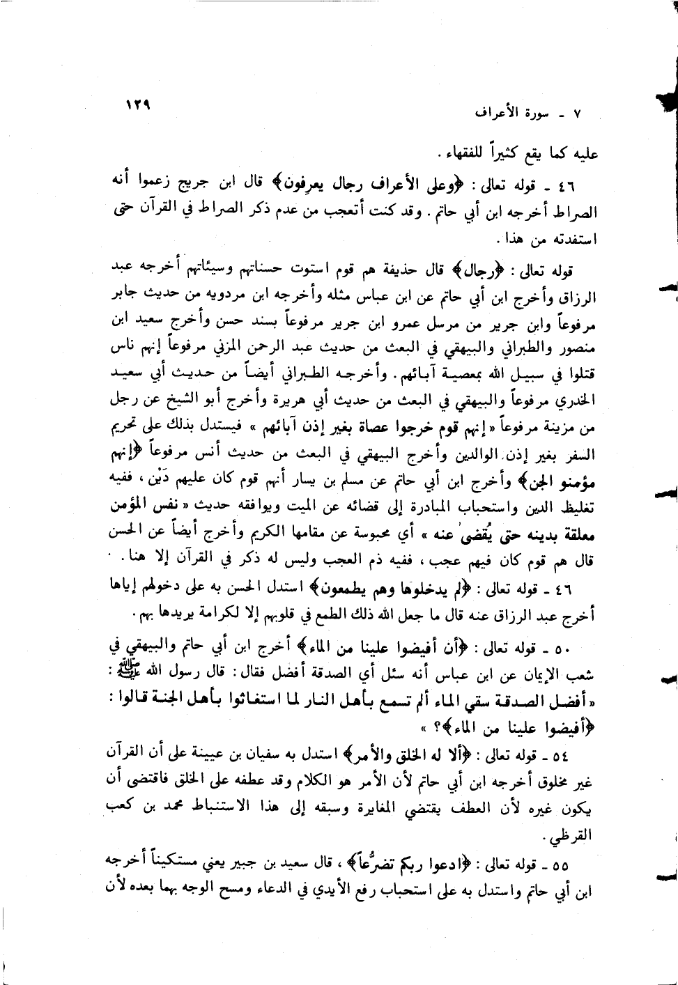 قال حذيفة هم قوم استوت حسناتهم وسيئاتهم أخرجه عبد الرزاق وأخرج إبنة أبي حاتم عن ابن عباس مثله وأخرجه ابن مردوية من حديث جابر مرفوعاً وإبن جرير من مرسل عمرو ابن مرفوعاً بسند حسن وأخرج سعيد ابن منصور والطبراني والبيهقي في البعث من حديث عبد الرحمن المزني مرفوعاً إنهم ناس قتلوا في سبيل الله بمعصية آبائهم. وأخرجه الطبراني أيضاً من حديث أبي سعيد الخدري مرفوعاً والبيهقي في البعث من حديث أبي هريرة وأخرج أبو الشيخ عن رجل من مزينة مرفوعاً "إنهم قوم خرجوا عصاة بغير إذن آبائهم" فيستدل بذلك على تحريم السفر بغير إذن الوالدين وأخرج البيهقي في البعث من حديث أنس مرفوعاً {إنهم مؤمنو الجن}