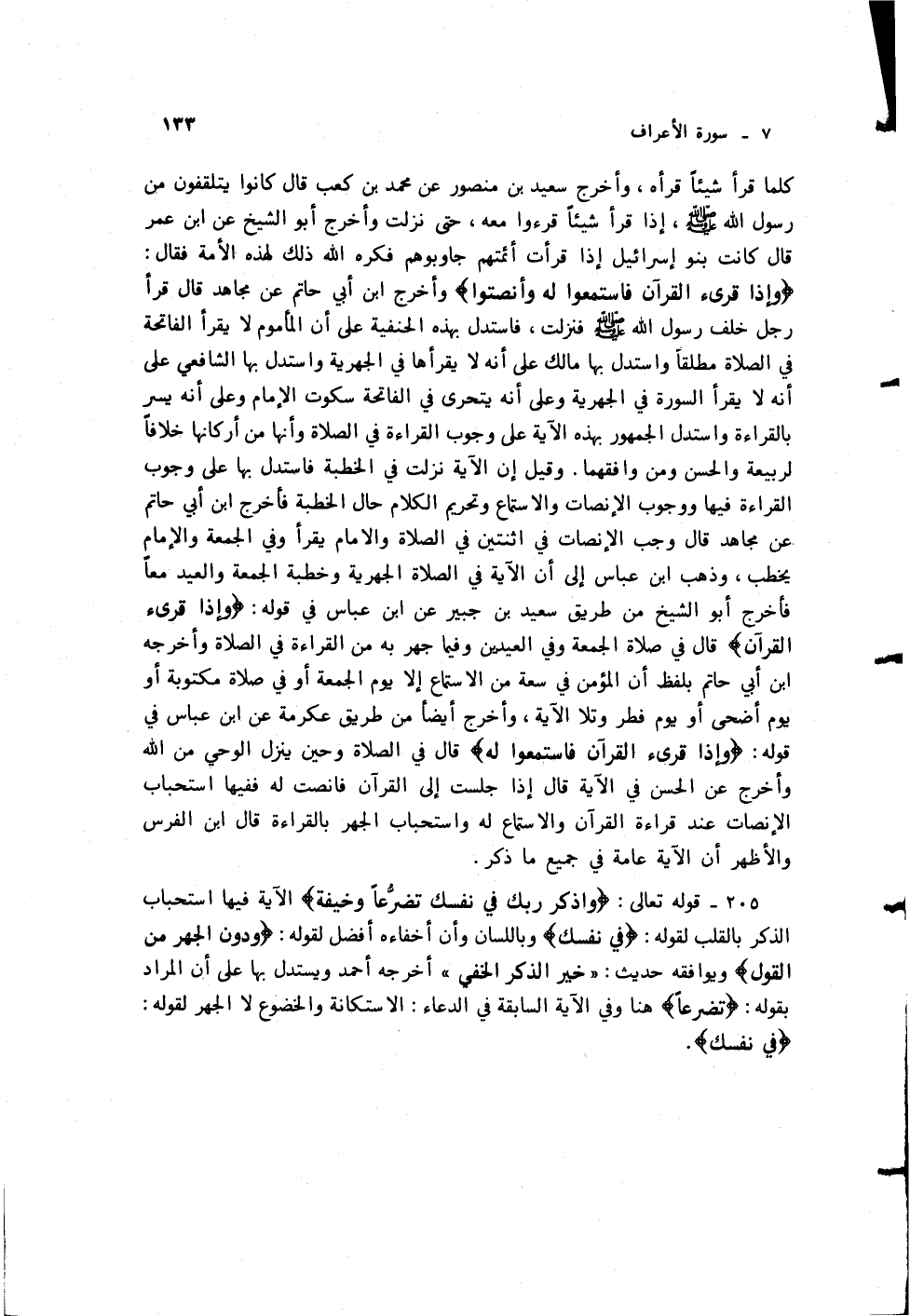 كلما قرأ شيئاً قرأه، وأخرج سعيد بن منصور عن محمد بن كعب قال كانوا يتلقفون من رسول الله - صلى الله عليه وسلم -، إذاقرأ شيئاً قرءوا معه، حتى نزلت وأخرج أبو الشيخ عن ابن عمر قال كانت بنو إسرائيل إذا قرأت أئمتهم جاوبوهم فكره الله ذلك لهذه الأمة فقال: {وَإِذَا قُرِئَ الْقُرْآنُ فَاسْتَمِعُوا لَهُ وَأَنْصِتُوا}