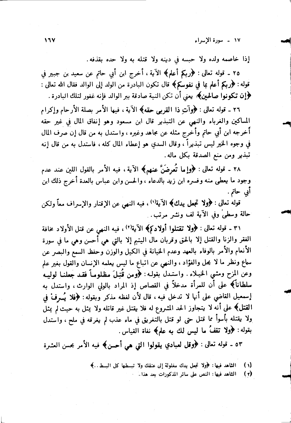 فيه النهي عن قتل الأولاد مخافة الفقر والزنا والقتل إلا بالحق وقربان مال اليتيم إلا بالتي هي أحسن وهي ما في سورة الأنعام والأمر بالوفاء بالعهد وعم الخيانة في الكيل والوزن وحفظ السمع والبصر عن سماع ونظر ما لا يحل والفؤاد، والنهي عن إتباع ما ليس يعلمه الإنسان والقول بغير علم وعن المزح ومشي الخيلاء. واستدل بقوله: {وَمَنْ قُتِلَ مَظْلُومًا فَقَدْ جَعَلْنَا لِوَلِيِّهِ سُلْطَانًا}