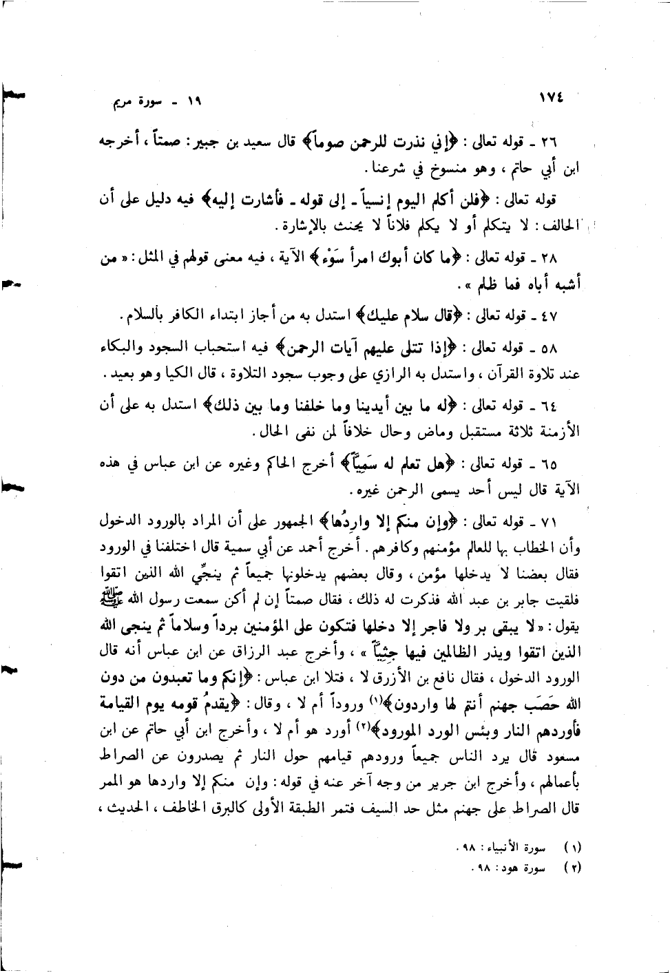 الجمهور على أن المراد بالورود الدخول وأن الخطاب بها للعالم مؤمنهم وكافرهم. أخرج أحمد عن أبي سمية قال اختلفنا في الورود فقال بعضنا لا يدخلها مؤمن، وقال بعضهم يدخلونها جميعاً ثم ينجي الله الذين اتقوا فلقيت جابر بن عبد الله فذكرت له ذلك، فقاغل صمتاً إن لم أكن سمعت رسول الله - صلى الله عليه وسلم - يقول: "لايبقى بر ولا فاجر إلا دخلها فتكون على المؤمنين برداً وسلاماً ثم ينجي الله الذين اتقوا ويذر الظالمين فيها جثياً"، وأخرج عبد الرازق عن ابن عباس أنه قال الورود الدخول، فقال نافع بن الأزرق لا، فتلا ابن عباس: {إِنَّكُمْ وَمَا تَعْبُدُونَ مِنْ دُونِ اللَّهِ حَصَبُ جَهَنَّمَ أَنْتُمْ لَهَا وَارِدُونَ}