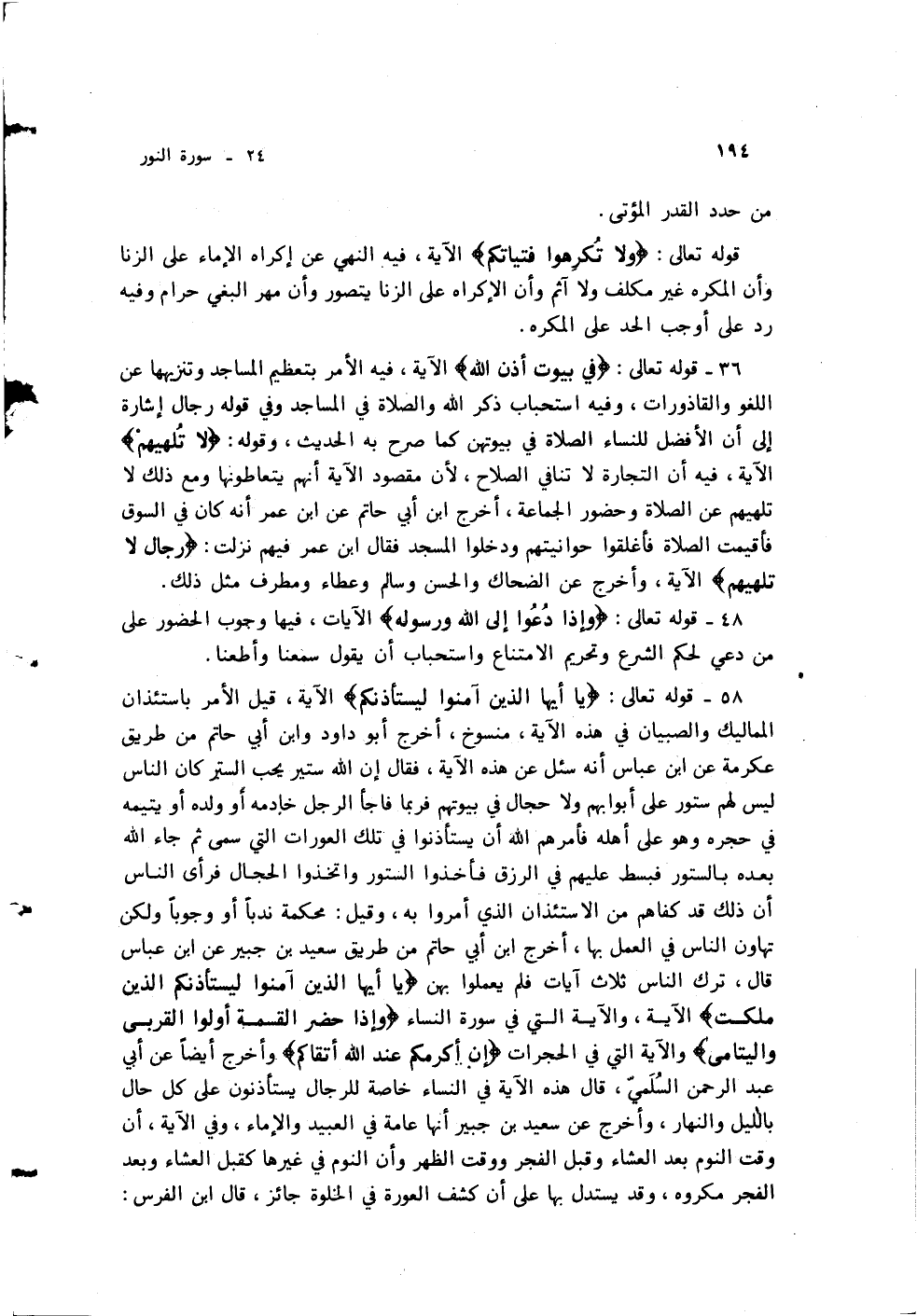 وأخرج أيضاً عن أبي عبد الرحمن السلمي، قال هذه الآية في النساء خاصة للرجال يستأذنون على كل حال بالليل والنهار، وأخرج عن سعيد بن جبير أنها عامة في العبيد والإماء، في الآية، أن وقت النوم بعد العشاء وقبل الفجر ووقت الظهر وأن النوم في غيرها كقبل العشاء وبعد الفجر مكروه، وقد يستدل بها على أن كشف العورة في الخلوة جائز، قال ابن الفرس: