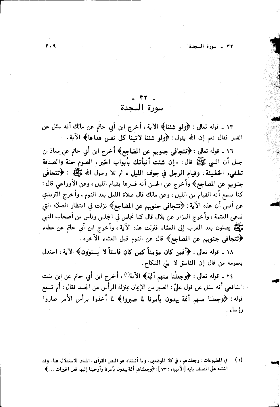 أخرج ابن أبي حاتم عن معاذ بن جبل أن النبي - صلى الله عليه وسلم - قال: "إن شئت أنبأتك بأبواب الخير، الصوم جنة والصدقة تطفيء الخطيئة، وقيام الرجل في جوف الليل" ثم تلا رسول الله - صلى الله عليه وسلم -: {تَتَجَافَى جُنُوبُهُمْ عَنِ الْمَضَاجِعِ}