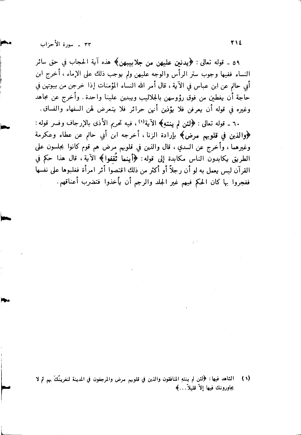 هذه آية الحجاب في حق سائر النساء ففيها وجوب ستر الرأس والوجه عليهن ولم يوجب ذلك على الإماء، أخرج ابن أبي حاتم عن ابن عباس في الآية، قال أمر الله النساء المؤمنات إذا خرجن من بيوتهن في حاجة أن يغطين من فوق رؤوسهن بالجلاليب ويبدين علينا واحدة. وأخرج عن مجاهد وغيره في قوله أن يعرفن فلا يؤذين أنهن حرائر فلا يتعرض لهن السفهاء والفساق.