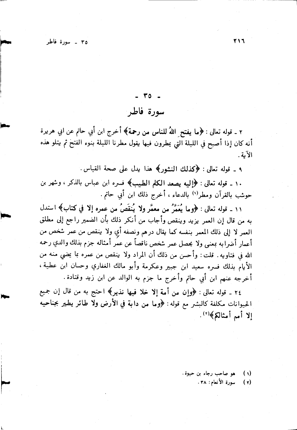 استدل به من قال إن العمر يزيد وينقص وأجاب من أنكر ذلك بأن الضمير راجع إلى مطلق العمر لا إلى ذلك المعمر بنفسه كما يقال درهم ونصفه أي ولا ينقص من عمر شخص من أعمار أضرابه بمعنى ولا يحصل عمر شخص ناقصاً عن عمر أمثاله جزم بذلك والدي رحمه الله في فتاويه. قلت: وأحسن من ذلك أن المراد ولا ينقص من عمره بما يمضي منه من الأيام بذلك فسره سعيد ابن جبير وعكرمة وأبو مالك الغفاري وحسان ابن عطية، أخرجه عنهم ابن أبي حاتم وأخرج ما جزم به الوالد عن ابن زيد وقتادة.