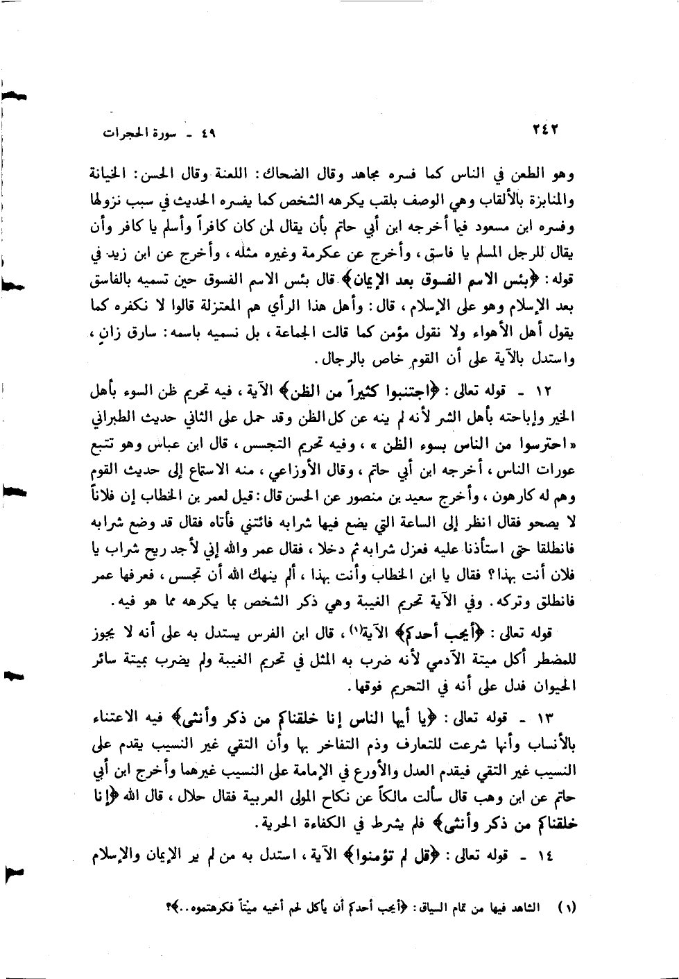 قال بئس الاسم الفسوق حين تسميه بالفاسق بعد الإسلام وهو على الإسلام، قال: وأهل هذا الرأي هم المعتزلة قالوا لا نكفره كما يقول أهل الأهواء ولا نقول مؤمن كما قالت الجماعة، بل نسميه باسمه: سارق زان، واستدل بالآية على أن القوم خاص بالرجال.