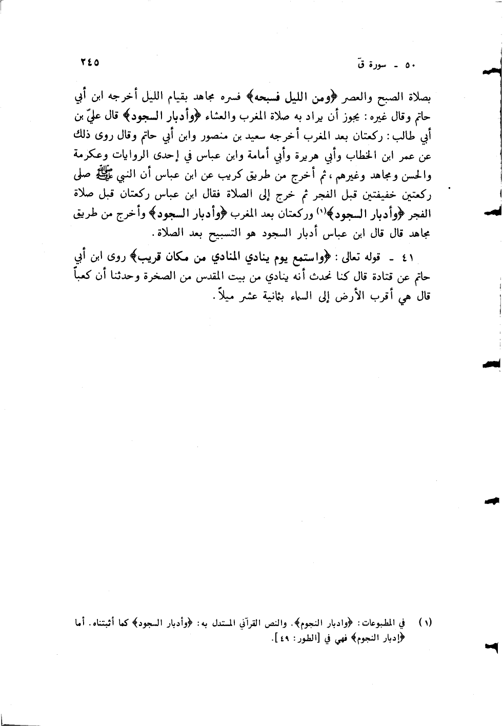 قال علي بن أبي طالب: ركعتان بعد المغرب أخرجه سعيد بن منصور وإبن أبي حاتم وقال روى ذلك عن عمر ابن الخطاب وأبي هريرة وأبي أمامة وإبن عباس في إحدى الروايات وعكرمة والحسن ومجاهد وغيرهم، ثم أخرج من طريق كريب عن ابن عباس أن النبي - صلى الله عليه وسلم - صلى ركعتين خفيفتين قبل الفجر ثم خرج إلى الصلاة فقال ابن عباس ركعتان قبل صلاة الفجر {وَأَدْبَارَ السُّجُودِ}