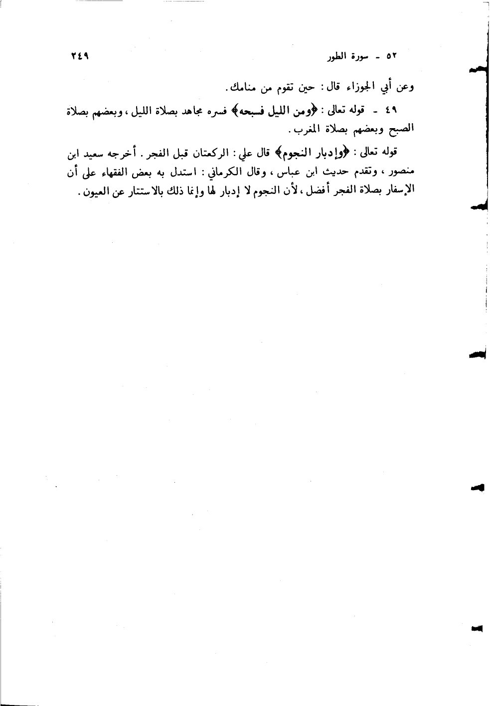 قال علي: الركعتان قبل الفجر. أخرجه سعيد ابن منصور، وتقدم حديث ابن عباس، وقال الكرماني: استدل به بعض الفقهاء على أن الإسفار بصلاة الفجر أفضل، لأن النجون لا إدبار لها وإنما ذلك بالاستتار عن العيون.