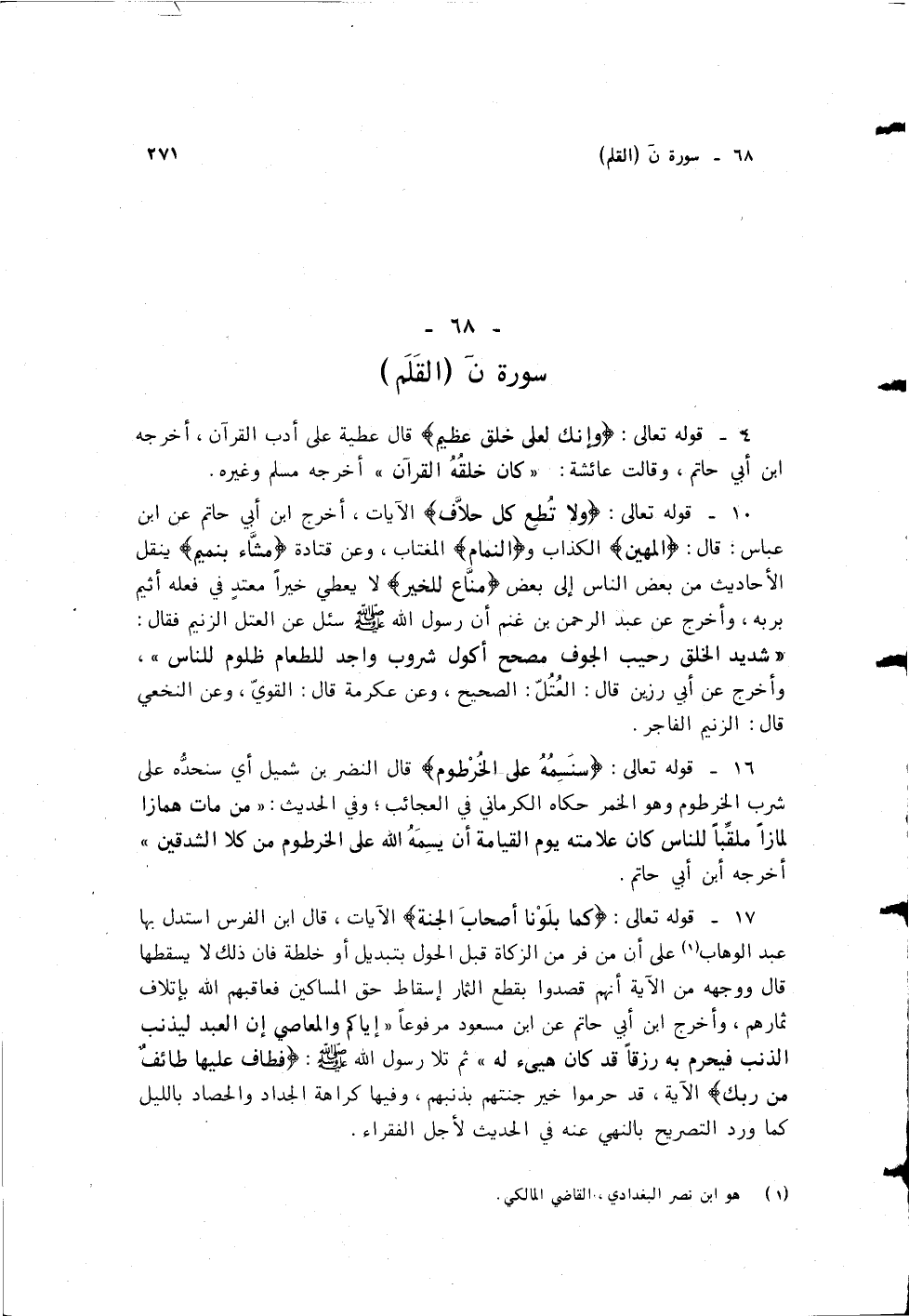 لا يعطي خيراً معتد في فعله أثيم بربه، وأخرج عن عبد الرحمن بن غنم أن رسول الله - صلى الله عليه وسلم - سئل عن العتل الزنيم فقال: "شديد الخلق رحيب الجوف مصحح أكول شروب واجد للطعام ظلوم للناس"، وأخرج عن أبي رزين قال: العُتُلَ: الصحيح، وعن عكرمة قال: القوي، وعن النخعي قال: الزنيم الفاجر.
