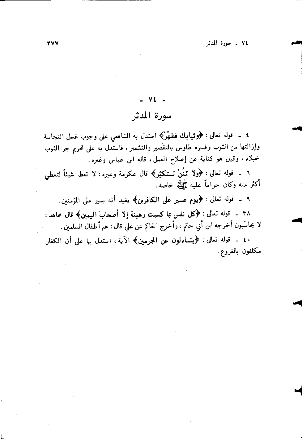 استدل به الشافعي على وجوب غسل النجاسة وإزالتها من الثوب وفسره طاوس بالتقصير والتشمير، فاستدل به على تحريم جر الثوب خبلاء، وقيل هو كناية عن إصلاح العمل، قاله ابن عباس وغيره.