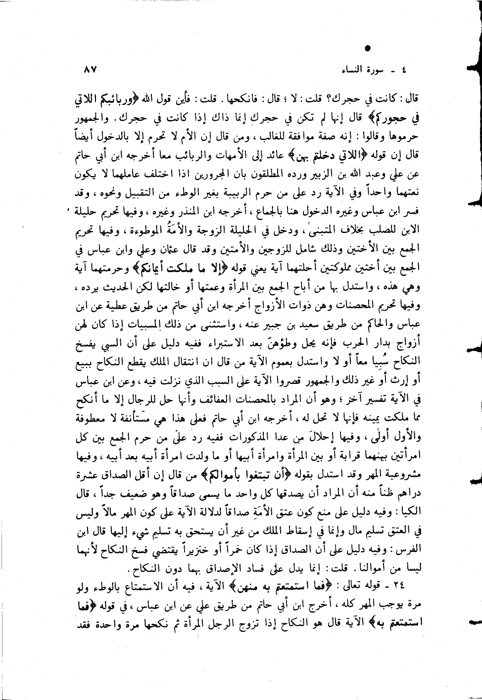 وحرمتهما آية وهي هذه، وأستدل بها من أباح الجمع بين المرأة وعمتها أو خالتها لكن الحديث يرده، وفيها تحريم المحصنات وهن ذوات الأزواج أخرجه ابن أبي حاتم من طريق عطية عن ابن عباس والحاكم من طريق سعيد بن جبير عنه، واستثنى من ذلك المسبيات إذا كان لهن أزواج بدار الحرب فإنه يحل وطؤهن بعد الإستبراء ففيه دليل على أن السبي يفسخ النكاح سبيا معاً أو لا وأستدل بعموم الآية من قال إن أنتقال الملك يقطع النكاح ببيع أو إرث أو غير ذلك والجمهور قصروا الآية على السبب الذي نزلت فيه، وعن ابن عباس في الآية تفسير آخر، وهو أن المراد بالمحصنات العفائف وأنها حل للرجال إلا ما أنكح مما ملكت يمينه فإنها لا تحل له، أخرجه ابن ألي حاتم فعلى هذا هي مستأنفة لا معطوفة والأول أولى، وفيها إحلال من عدا المذكورات ففيه رد على من حرم الجمع بين كل امرأتين بينهما قرابة أو بين امرأة أبيها أو ما ولدت امرأة أبيه بعد أبيه، وفيها مشروعية المهر وقد أستدل بقوله {أَنْ تَبْتَغُوا بِأَمْوَالِكُمْ}