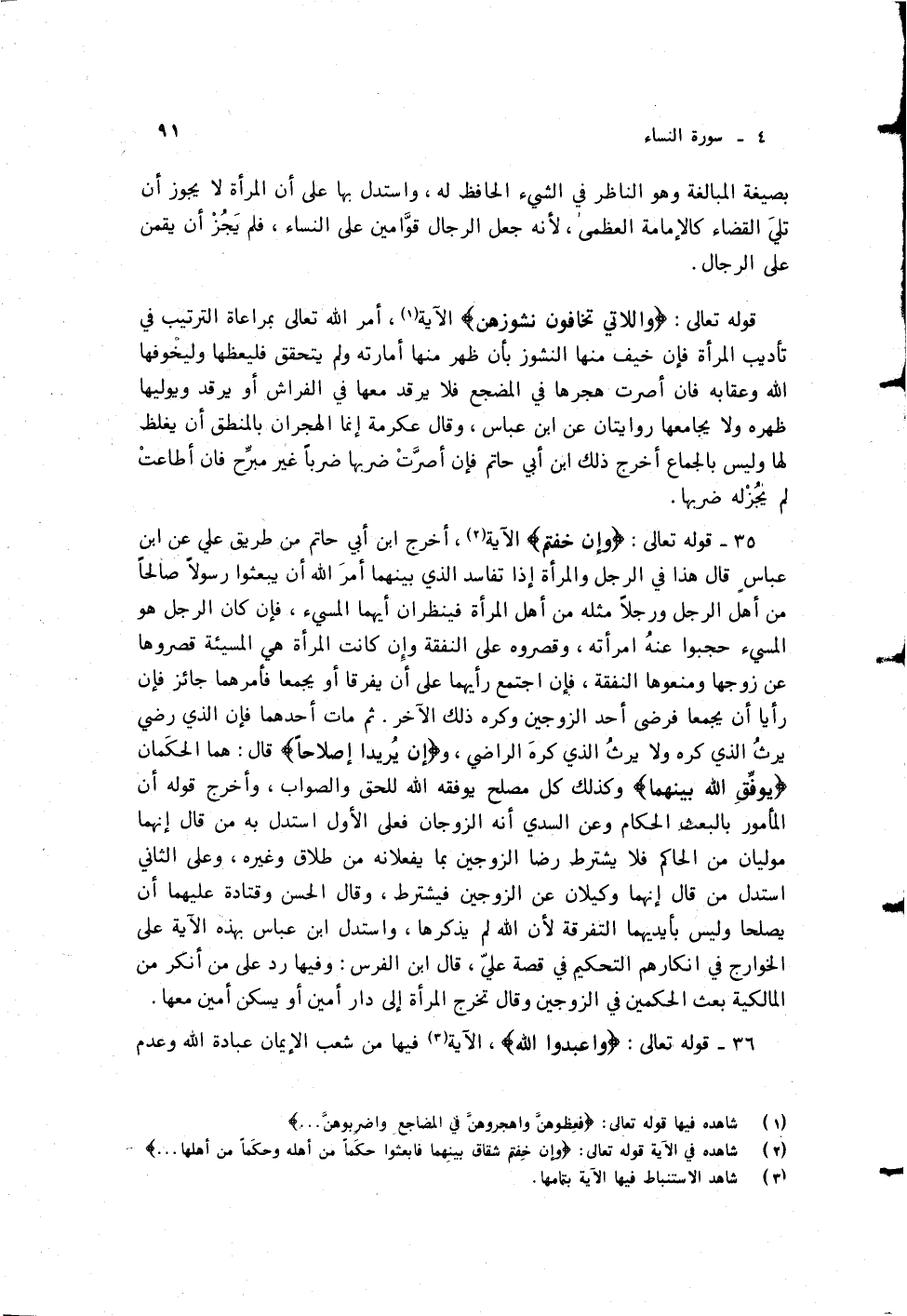 أمر الله تعالى بمراعاة الترتيب في تأديب المرأة فإن خيف منها النشوز بأن ظهر منها أمارته ولم يتحقق فليعظها وليخوفها الله وعقابه فإن اصرت هجرها في المضجع فلا يرقد معها في الفراش أو يرقد ويوليها ظهره ولا يجامعها روايتان عن ابن عباس، وقال عكرمة إنما الهجران بالمنطق أن يغلظ لها وليس بالجماع أخرج ذلك ابن أبي حاتم فإن اصرت ضربها ضرباً غير مبرح فإن أطاعت لم يجزله ضربها.